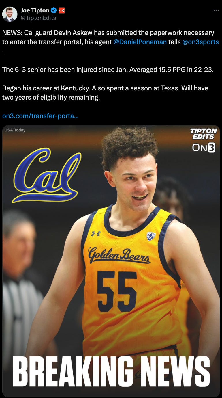 Askew struggled with injury during his time in Berkeley, playing only 13 games in 2022-23 due to sports hernia surgery and six games in 2023-24 due to a foot issue. Askew was a top scorer last season but deferred more for a much stronger Cal team this year. He probably could have competed for significant playing time next season, but it might not have been a given he could start, which might be what Askew is looking for as he nears the end of his time in college.