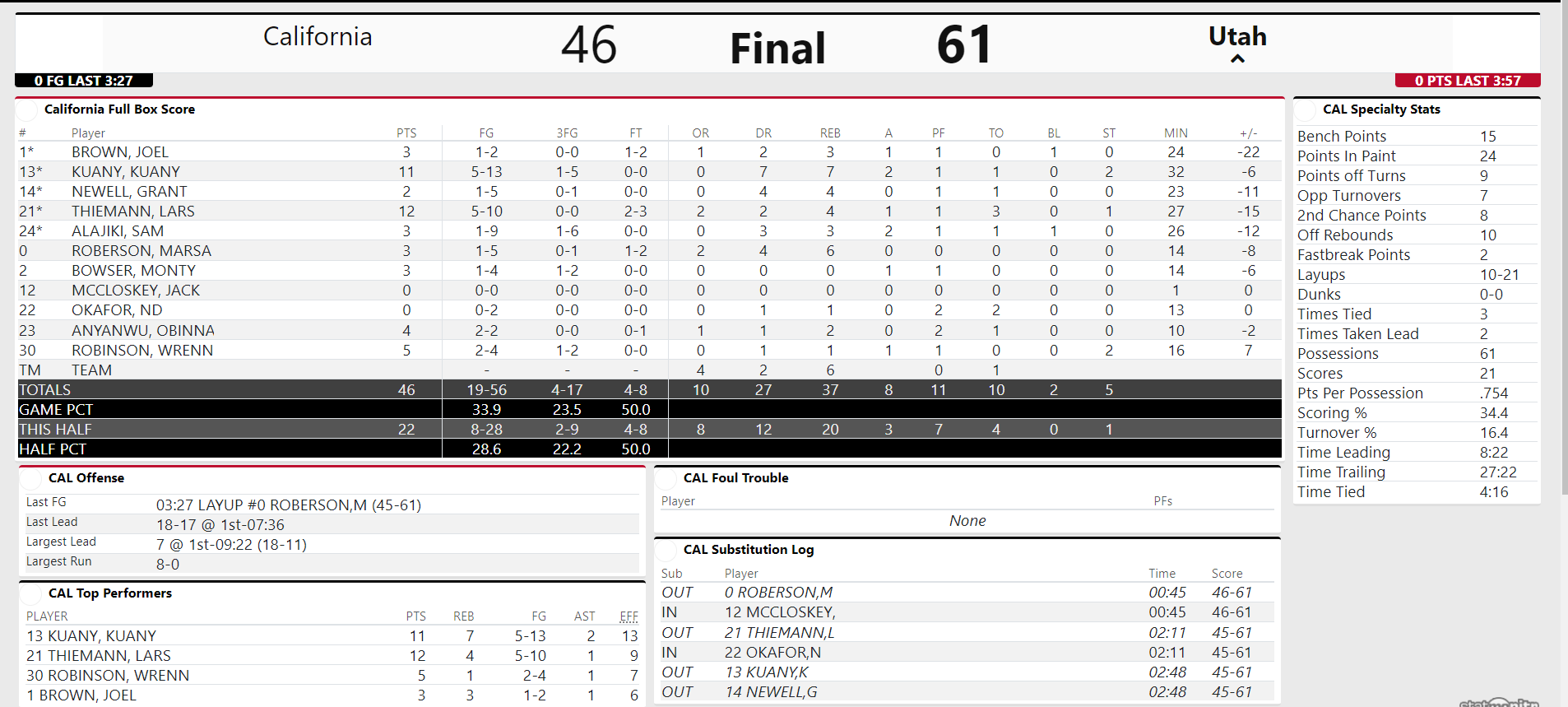 Kuany Kuany and Lars Thiemann played well, finishing with 23 points combined on 10-of-23 shooting. The wing group of Sam Alijiki, Grant Newell, Marsalis Roberson and Monty Bowser combined for 4-of-22 shooting and 11 points total.