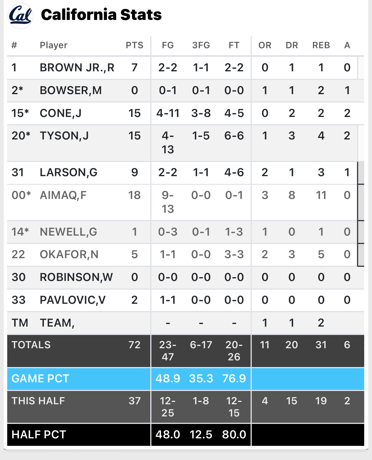 Fourth, UTEP did a far better job getting decent shots around the basket. Cal had too many poor shots under the basket; some even looked like the players were just throwing the ball up and hoping that they got lucky or got fouled.