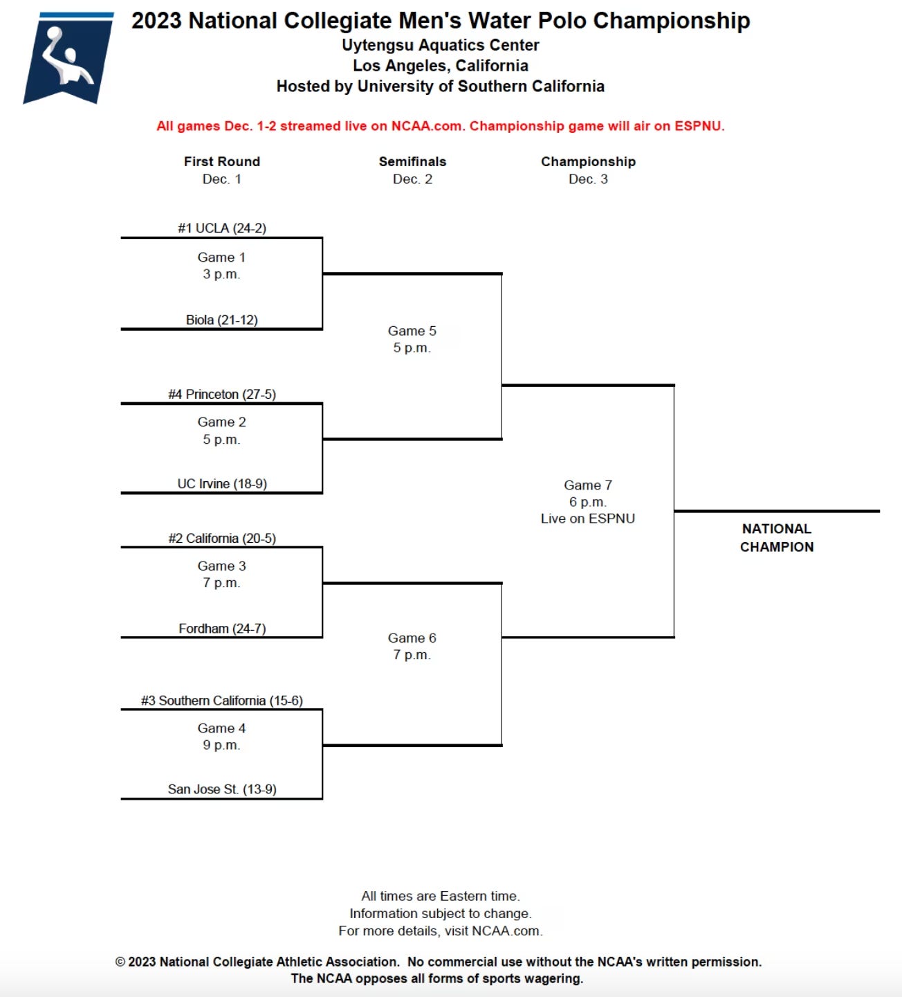 The NCAA Men's Water Polo championship was a four-team affair for a long time before the expansion to six teams back in 2013. That field expansion saw the introduction of a second at-large bid to greatly ease the importance of the MPSF tournament on the penultimate weekend of action. The 2023 NCAA tournament will be the first with eight teams in the field, but the at-large bids remain at two. Out of Cal, UCLA, USC, and Stanford, Stanford again became the odd one out after an OT loss to Cal in the MPSF tournament semifinal, despite a 3rd-place win over UCLA. Although one can argue that the difference among the four California rivals is small, only three of four are alive for the NCAA title this weekend. The four schools got to duel it out at the COVID-delayed 2020 NCAA championship that took place in the spring of 2021, the last one not won by Cal, due to no automatic bids that year; UCLA claimed that title with a win over USC in the final.