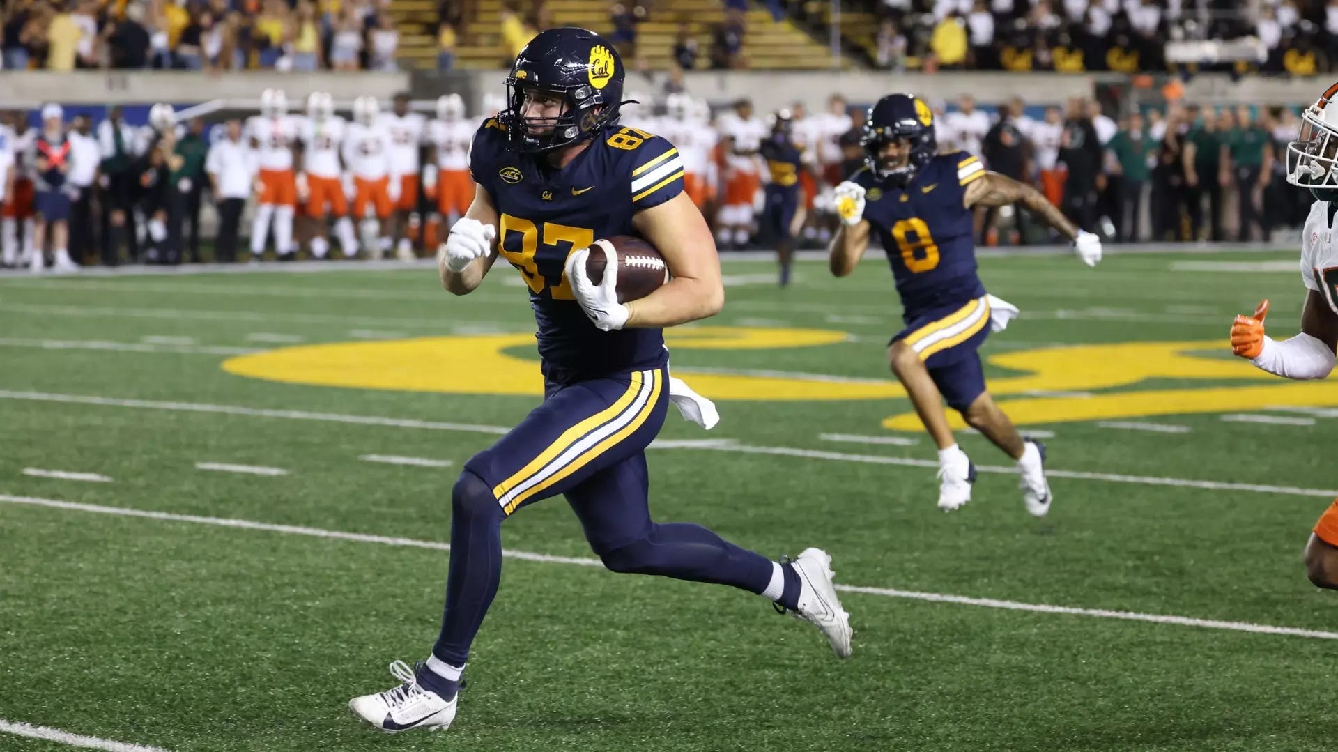 The visiting Hurricanes gained only 12 yards on their first drive and scored only one touchdown in the first half. In contrast, Golden Bear quarterback Fernando Mendoza found Jack Endries for a 57-yard touchdown at the end of the first quarter and Jaydn Ott for a 66-yard reception in the middle of the second period. The latter gave Cal a 21-10 lead, as Ott added a five-yard rushing touchdown at the start of the second quarter.