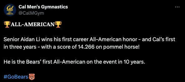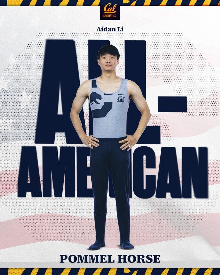 Senior Aidan Li earned All-American honor via a 7th place tie in pommel horse. He became the first Cal Bears to earn All-American honor since Caleb Rickard placed 5th on vault in 2021 and the first Cal pommel horse All-American since Donothan Bradley’s 7th place in 2014.