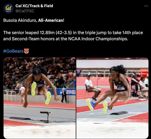 The lone Cal women of the quartet, Busola Akinduro finished 14th in triple jump.