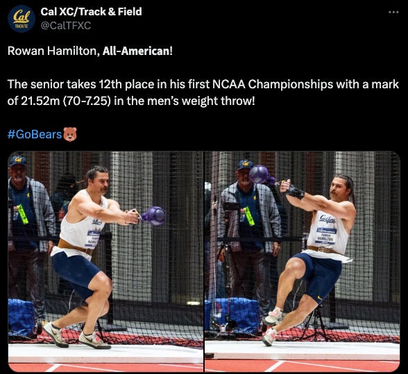David Forster, the first Cal male sprinter to qualify for the NCAA indoors, placed 11th. Rowan Hamilton, continuing Cal’s great recent run in weight tossing, placed 12th in men’s weight toss. Skyler Magula was not able to record a mark in men’s pole vault.