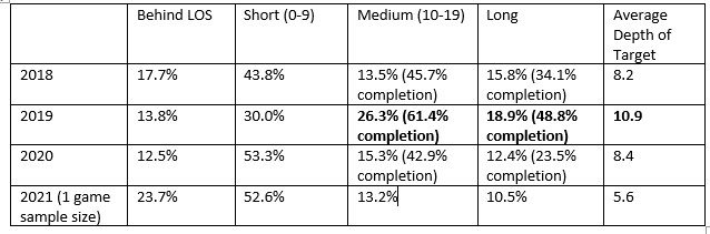 The numbers seem obvious, in their indication that he isn’t comfortable pushing the ball down the field. We can point to a lot of possible reasons as to why (constantly injured personnel, OL shuffling, etc), but when this is your second year with the OC, you would have hoped he is more comfortable doing so, and that just didn’t happen against the Wolfpack.