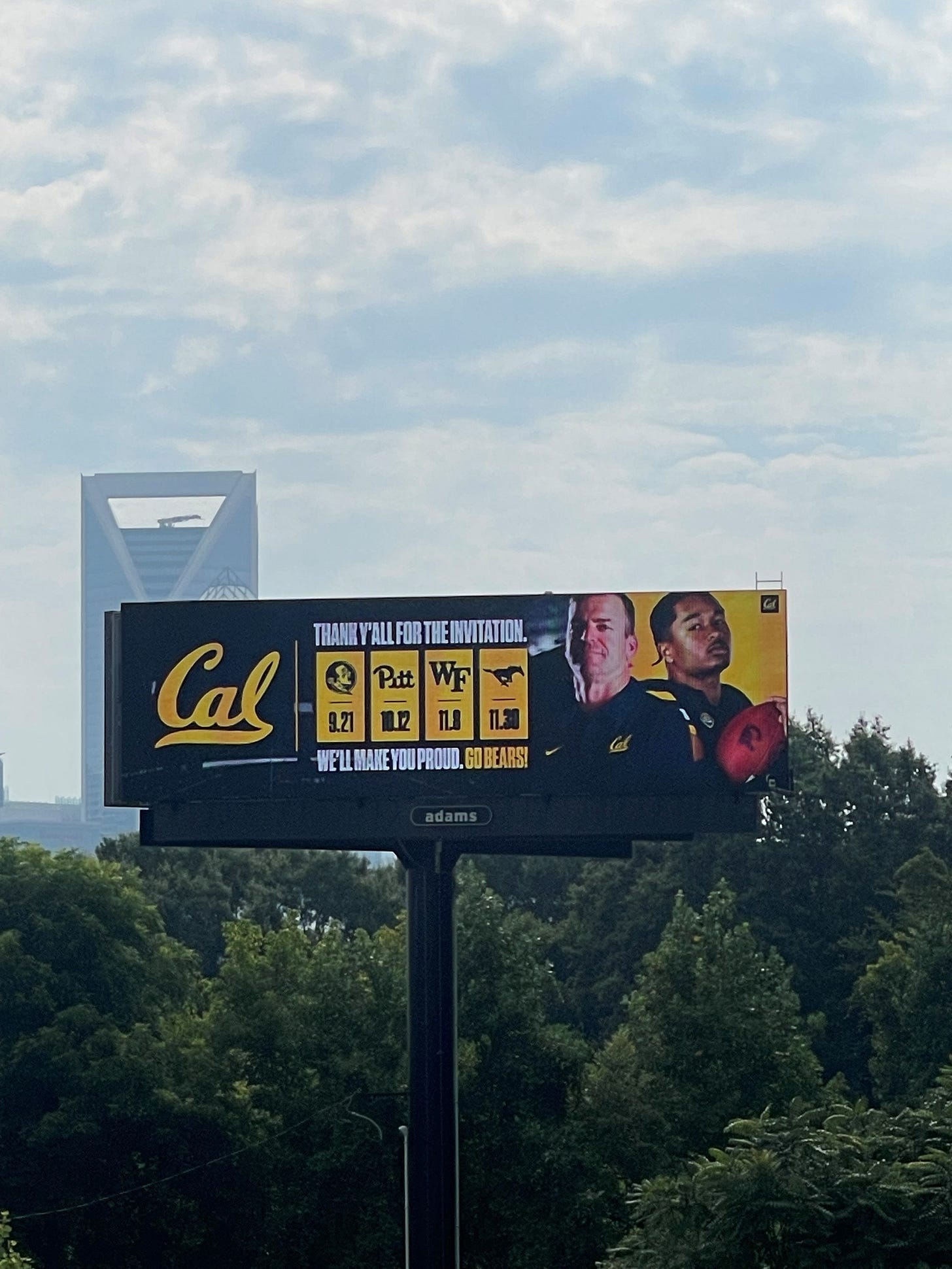 And now Cal Legends has reportedly moved to the brand marketing side, posting up funds for billboards in ACC country (this billboard below is in Charlotte, North Carolina—Cal will play in-state on November 8th in Wake Forest). Sources confirm that there are several other billboards either already set up or being setup in other major ACC East Coast markets.