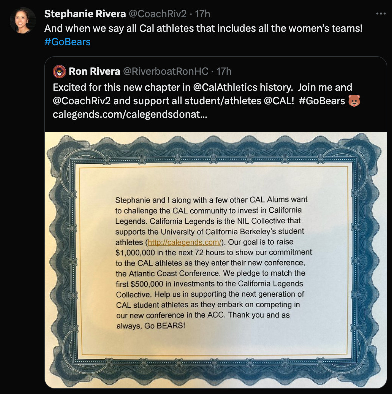 Cal fans, feel free to donate at Cal Legends NIL Collective and get the ball rolling for a new age in Cal Athletics! (I went ahead and put in a small donation to the football NIL, if football is the way you want to go.)