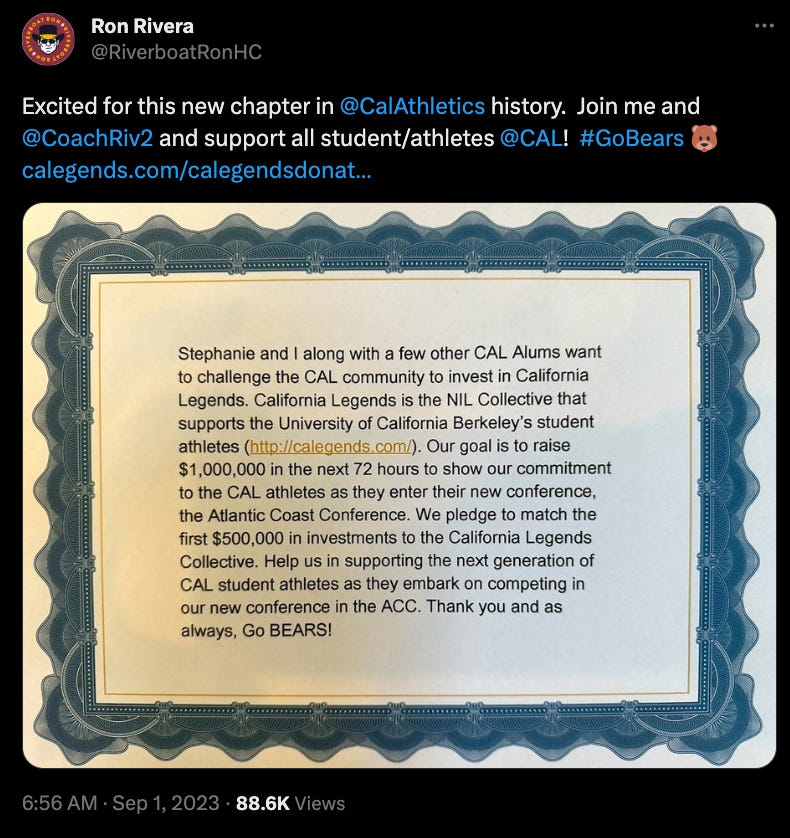 As all of us who have followed Cal Athletics closely know, there have been very significant shifts in donor engagement within the program. This includes Cal alumni starting the Legends Collective so Cal athletes are provided the proper support in a competitive athletics landscape.