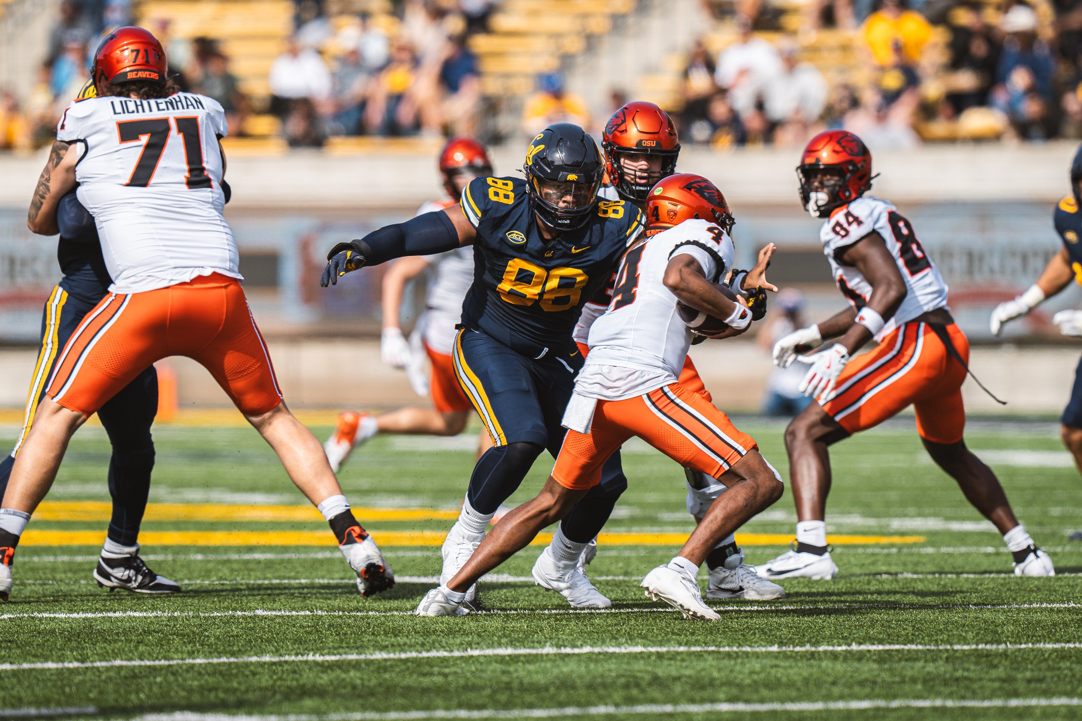 California's offense rolled against Oregon State, scoring on all but one of its possessions. The home team's air game was particularly effective, despite the Golden Bears' star running back Jaydn Ott starting the game after dealing with nagging injuries this season. Mendoza avoided sacks and connected with eight receivers, including five who had a perfect completion rate. Ott caught four out of four passes for 58 receiving yards and added 11 rushing yards on 10 attempts carrying the rock.