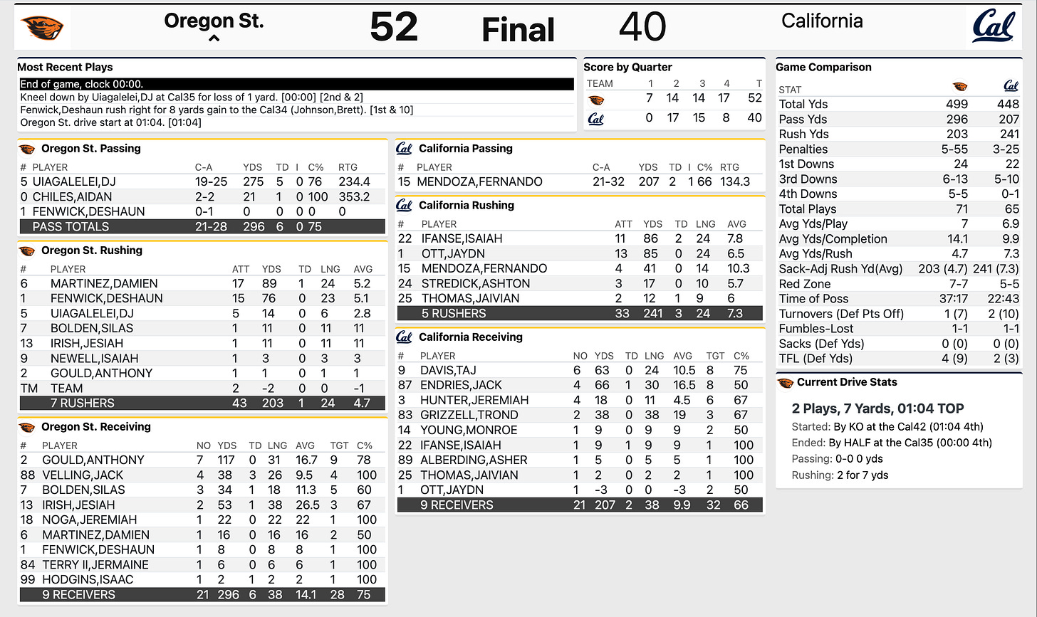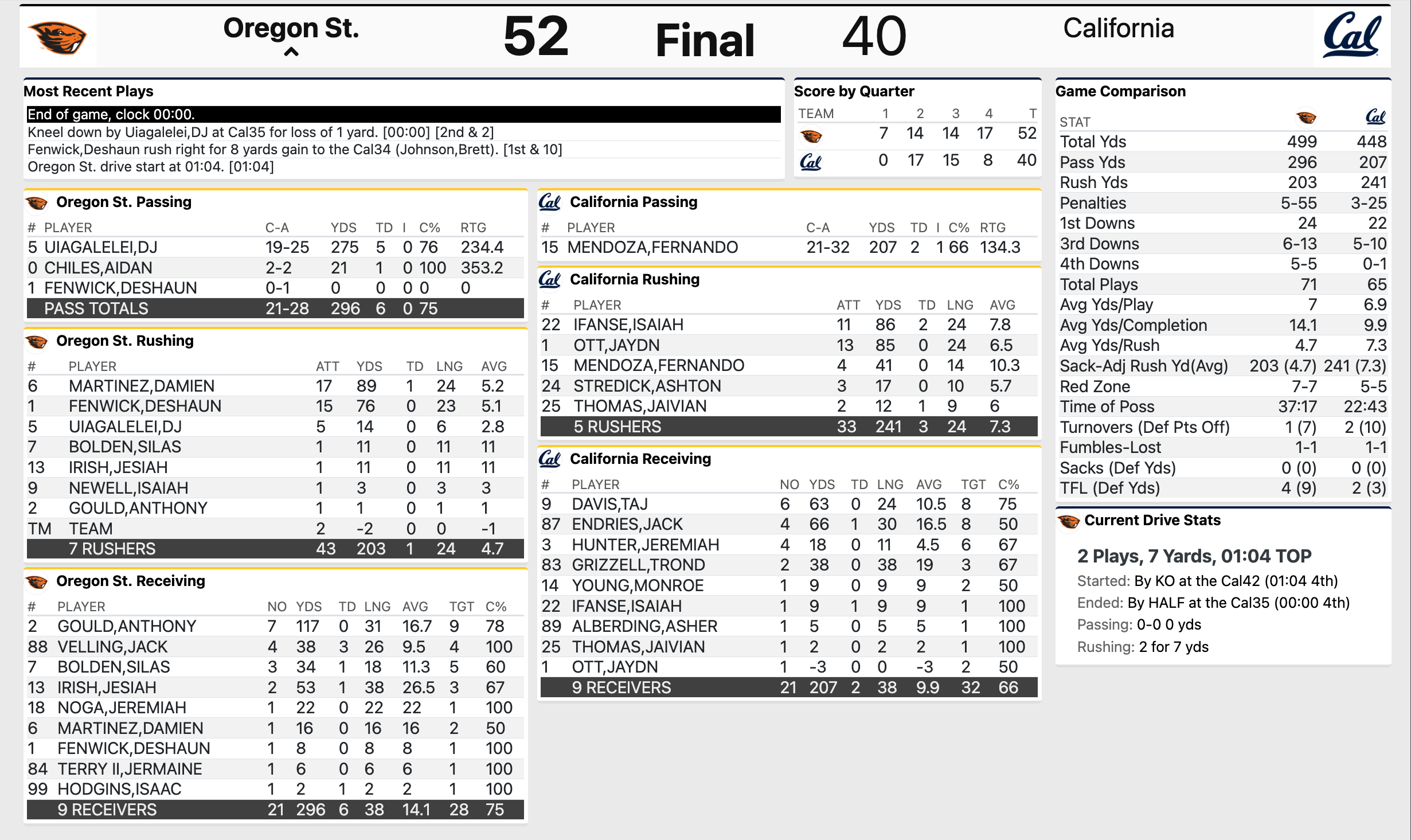 Uiagalelei finished the night with 275 passing yards and five passing touchdowns, completing 19 out of 25 passing attempts. The Beavers finished the night with 296 passing yards.