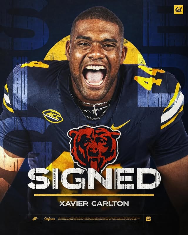The 2025 NFL Draft was a success for the Cal defense, as they saw four of their defenders get picked in Nohl Williams, Craig Woodson, Teddye Buchanan and Marcus Harris. They saw more good news, as Xavier Carlton signed as an undrafted free agent with the Chicago Bears. He will try and work to get on the roster to join his old teammate Elijah Hicks.