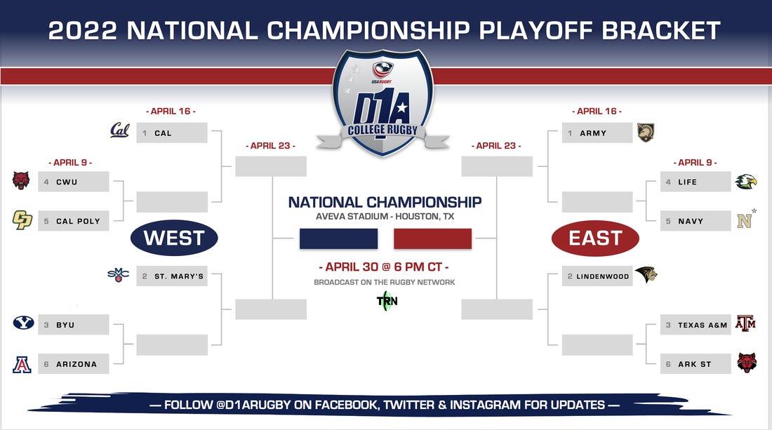 Only on Friday, April 1st did the Men’s D1A Rugby postseason bracket finally got revealed. BYU and Arizona will battle for the right to face Saint Mary’s in the quarterfinals. Out East, Army and Lindenwood are the top two seeds with Life, Navy, Texas A&M, and Arkansas State also making the playoffs.