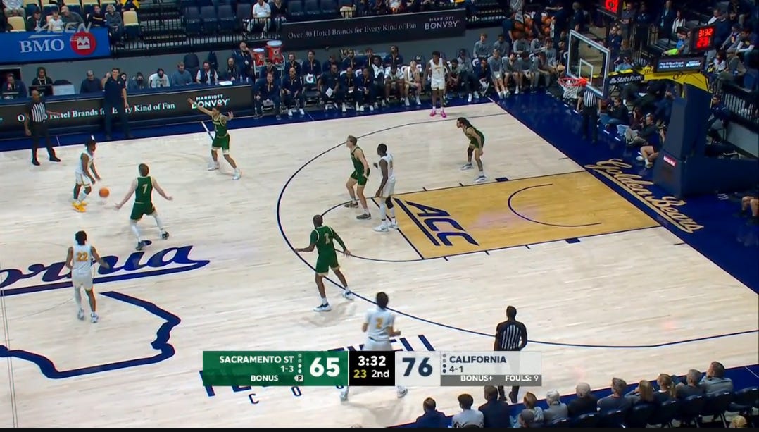 The Sacramento State Hornets played Cal even for the first 10 minutes of the game. A Cal 7-0 streak at the midway point of the first half extended Cal’s lead to 9 points, 27-18. The lead would fluctuate between 6 and 12 points for the rest of the half. Cal led 40-33 at the break. It was a balanced attack for the Bears, with five different players scoring between 5 and 9 points.