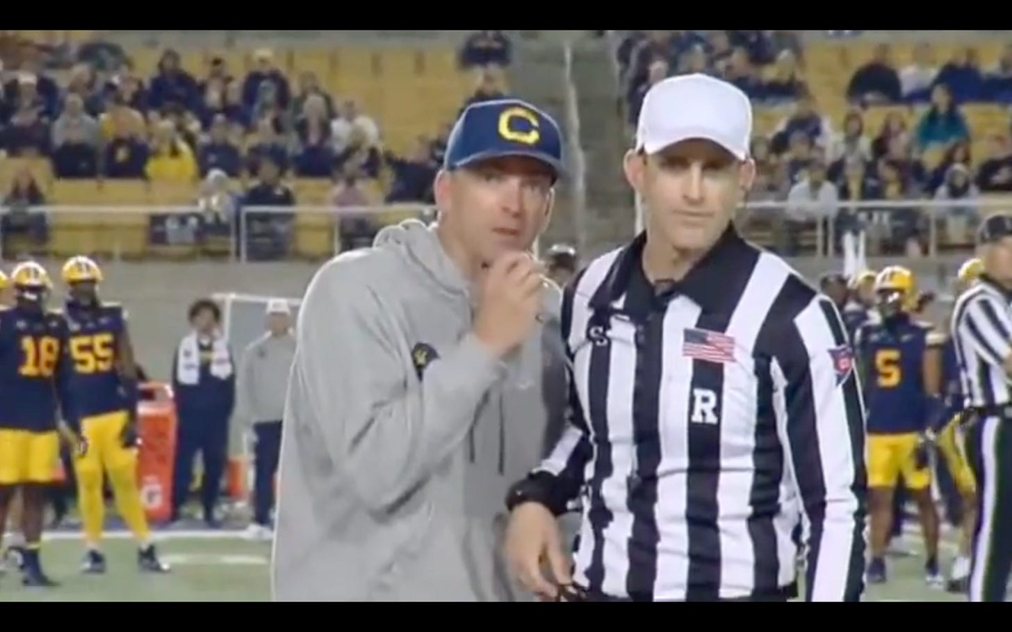 “Cal fans, we love you, but stop throwing the cards on the field,” Coach Wilcox said, speaking into the referee’s microphone. “That’s two 15-yard penalties. Please stop throwing the cards on the field.”
