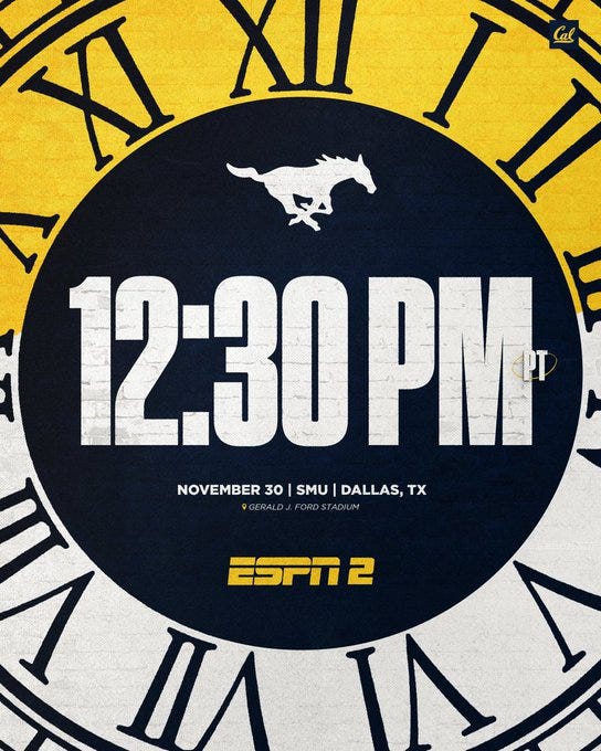 The California Golden Bears (5-5, 1-5 ACC) will play their last regular-season game at Southern Methodist (9-1, 6-0 ACC) on Saturday, Nov. 30, at 2:30 p.m. Central, according to an announcement from the Atlantic Coast Conference on Monday afternoon. The Cal v. SMU game will air on ESPN2.