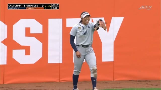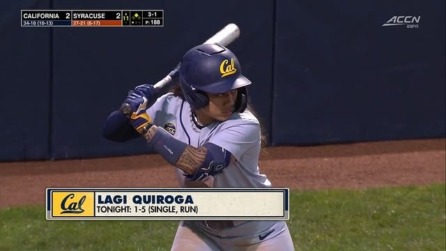 By the end of the game however Syracuse would score their only runs of the series, tying up the score 2-2 with an RBI sacrifice fly by catcher Laila Morales-Alves in the sixth, and an RBI fielder’s choice in the seventh. The game was sent into extras, with three complete innings passing before Cal finally put it away. In the top of the eleventh with a runner on second, Lagi Quiroga sent a go-ahead 2-RBI blast into right, putting the Bears up 4-2. Syracuse was not able to respond, and the sweep was sealed with a groundout to first base.