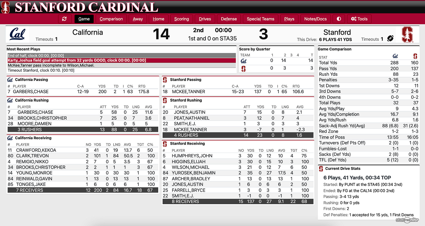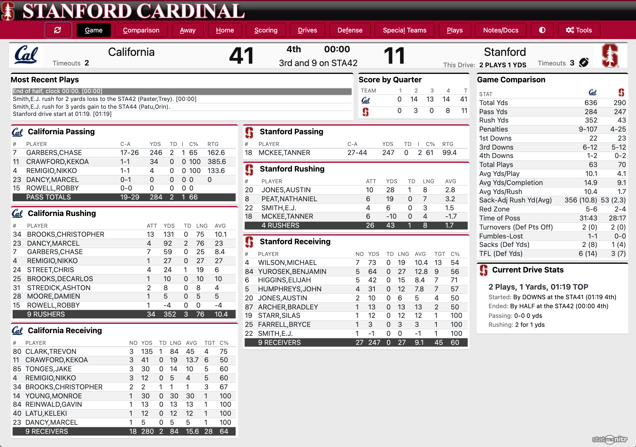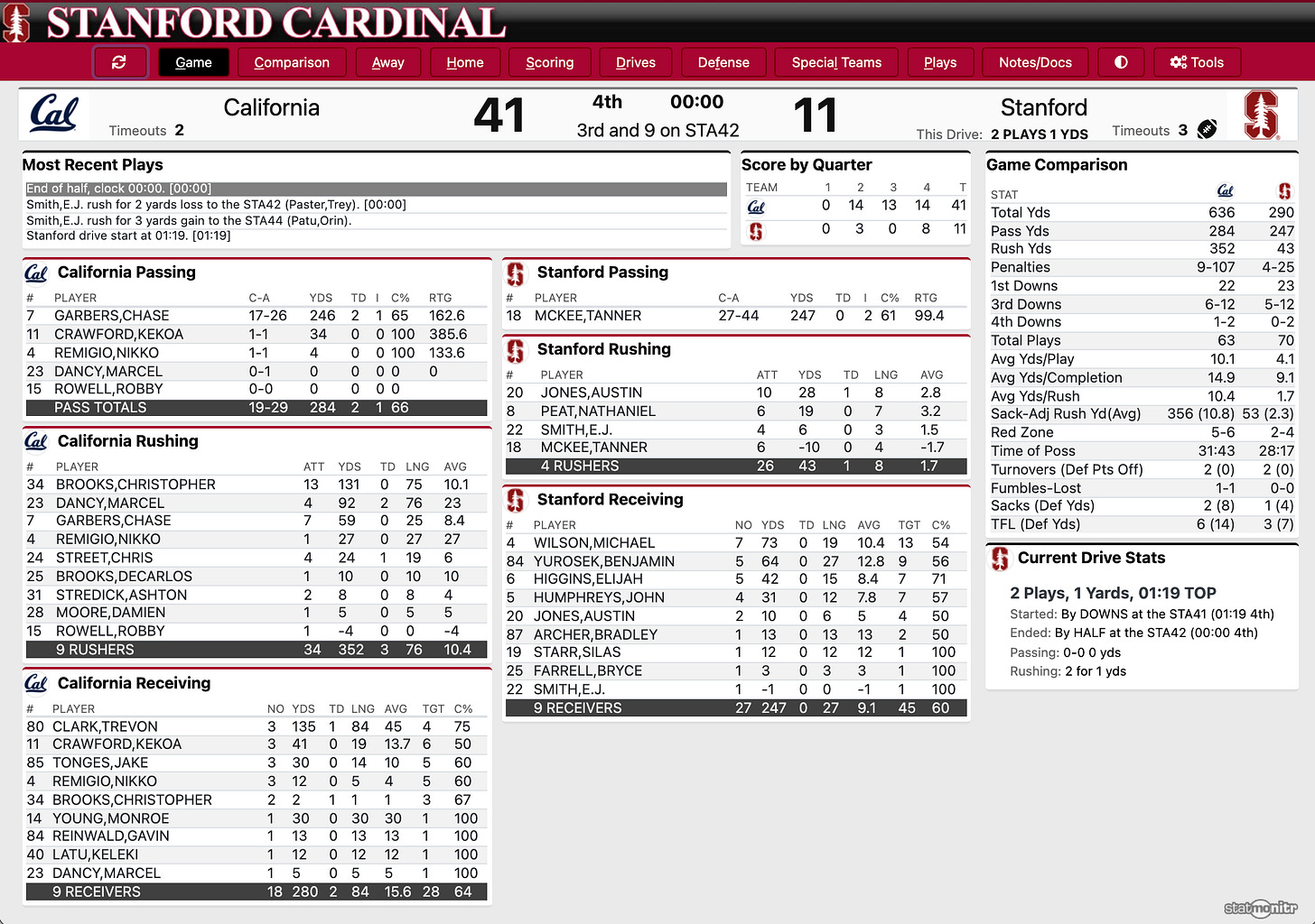 The California Golden Bears (4-6, 3-4 Pac-12) averaged 10.1 yards per play Saturday night, as they rolled to a 41-11 victory over the Stanford Cardinal (3-8, 2-7 Pac-12).