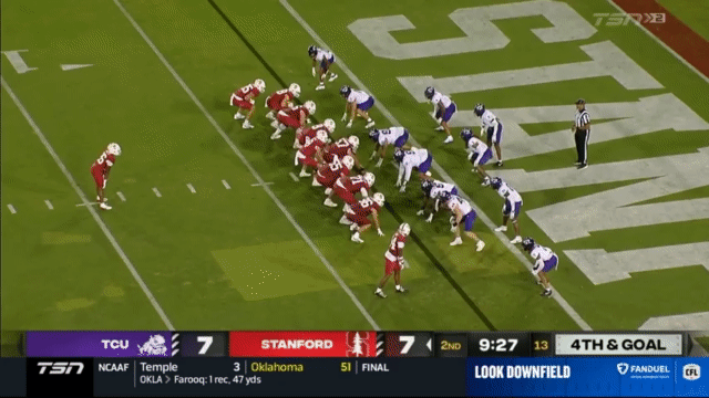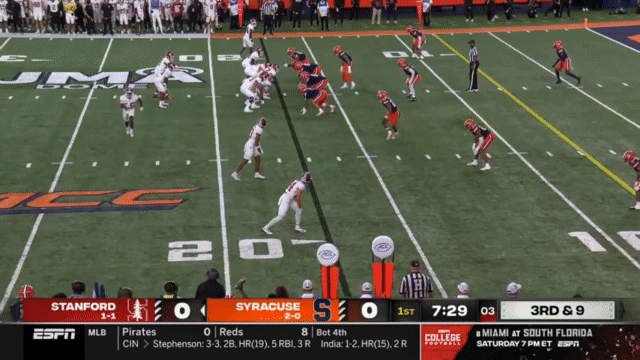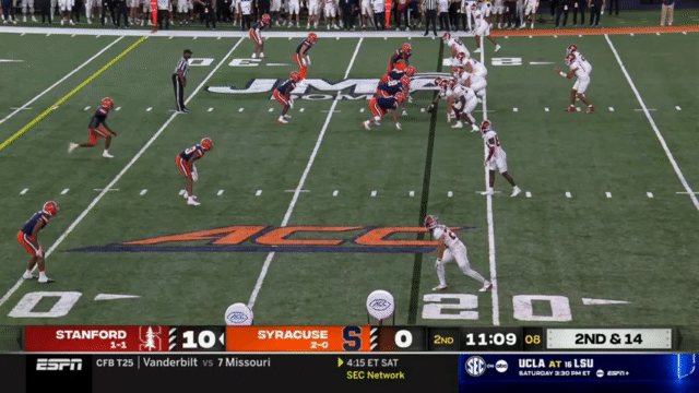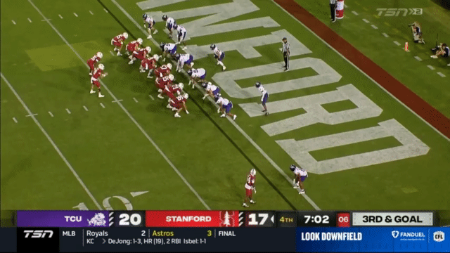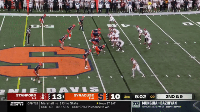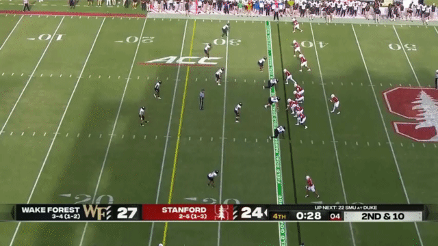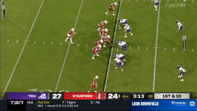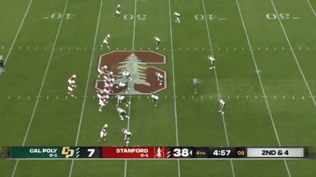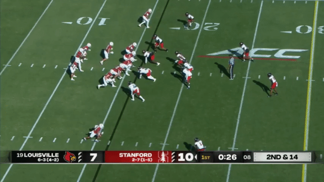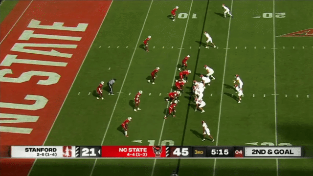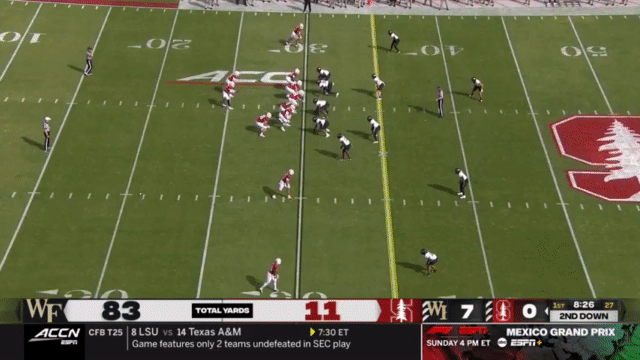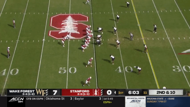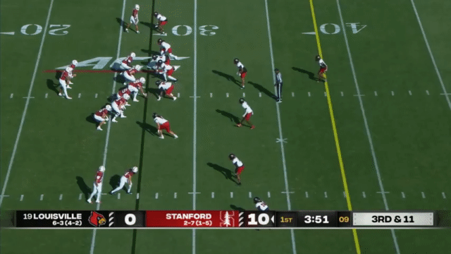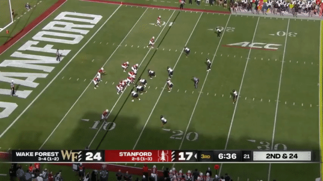 While Daniels’s passing has suffered, his running has reached a new level, and Daniels is incredibly dangerous running the ball. His 110 carries in 2023 went for 296 yards (2.7 yards/carry), but has jumped to 515 yards in 2024 (4.7 yards/carry). An empty backfield usually indicates a passing situation, but not so for Stanford, who will often run the quarterback in such scenarios: