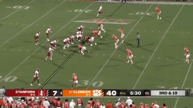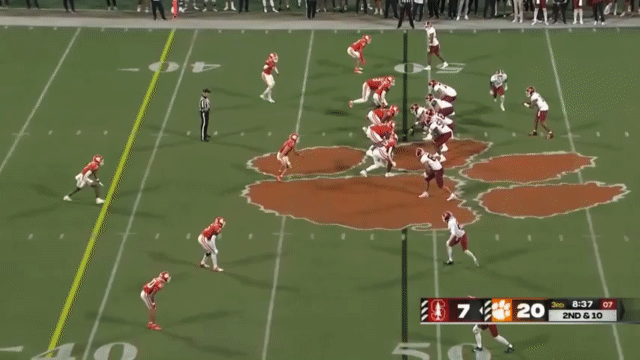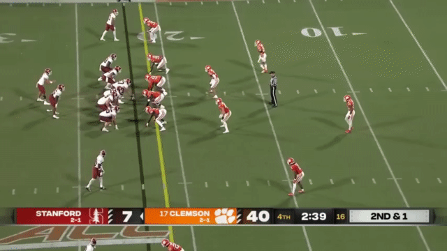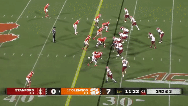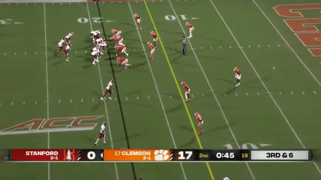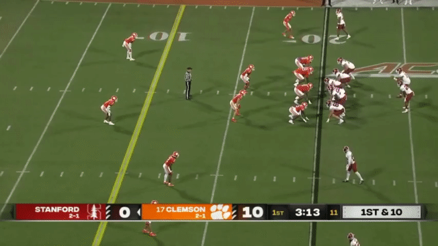 Stanford has a young running back room, and somehow sophomore Sedrick Irvin is the most veteran back (if you define “veteran” as “has the most carries for Stanford in prior seasons” so that I can exclude Ryan Butler who had a lot of carries at an FCS school). Irvin has appeared in a couple of highlights this season (Ctrl+F his name in this article), but no highlights of him running. So in the interest of inclusivity, I found his longest run of the season, which was this 19 yard carry against Clemson backups: