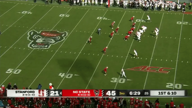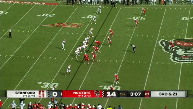 Last year, when Daniels was the “passing QB”, Justin Lamson was the “running QB”. This year, with Daniels as a running QB, Lamson is the… run even more QB. He did play as a traditional QB in two games this season: against Virginia Tech (when Daniels was injured), and against NC State (after Daniels was benched— Elijah Brown took over the SMU game when Daniels was benched in that one). Although the following play takes advantage of what the defense thought was going to be a QB sneak, it shows that Lamson still has the ability to put some nice placement on the throw: