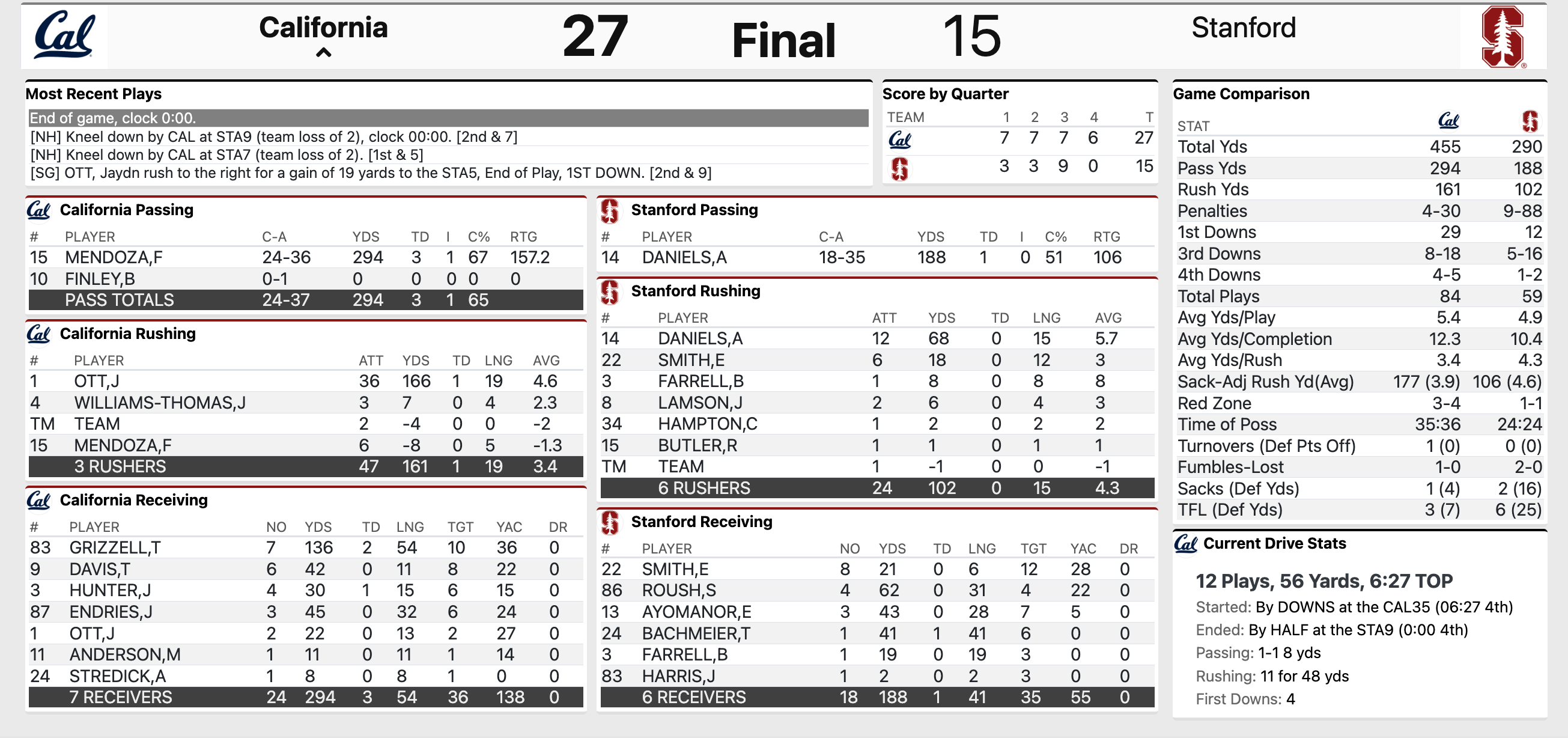 The California Golden Bears (5-6, 3-5 Pac-12) defeated the Stanford Cardinal (3-8, 2-7 Pac-12), 27-15, in a convincing Saturday evening victory.