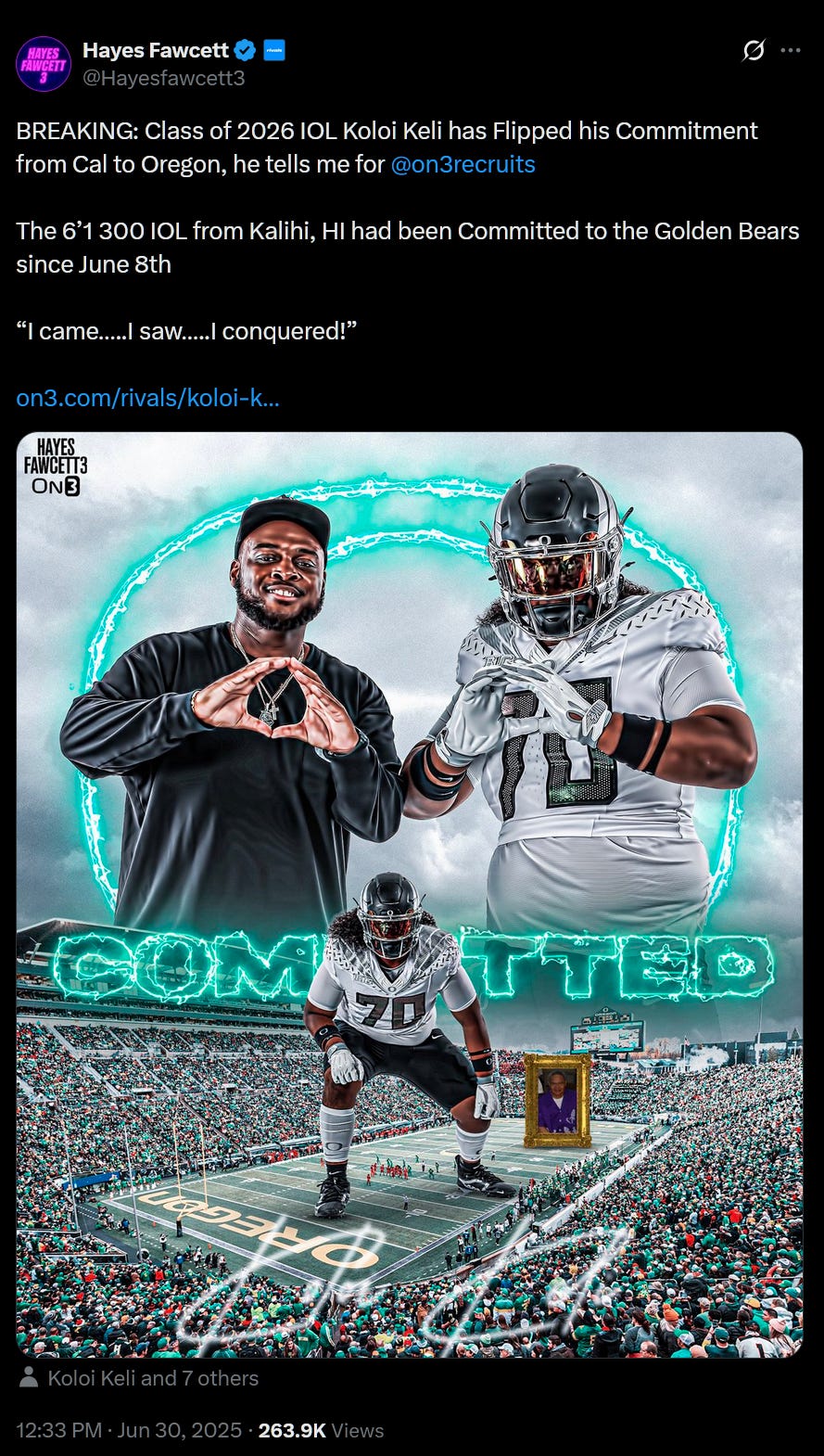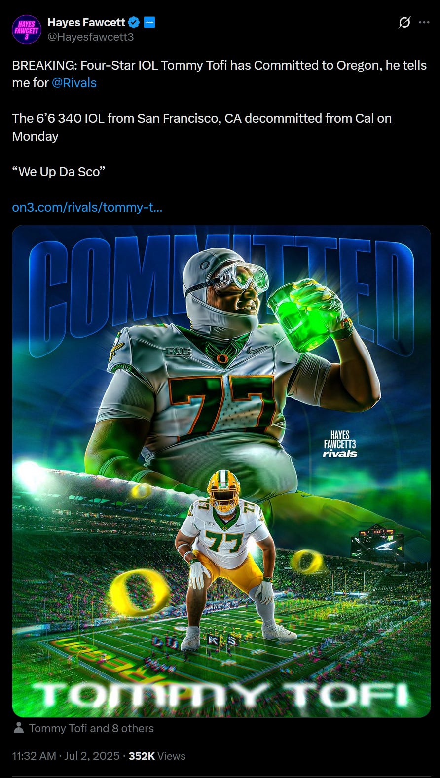 Cal’s top 2026 recruit at the time 4* Tommy Tofi and his fellow 3* Hawaiian OL Koloi Keli have decided to flip their commitment from Cal towards Oregon after their visits to Autzen earlier this week.