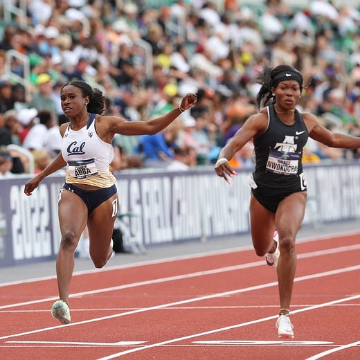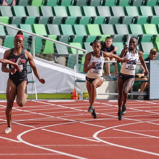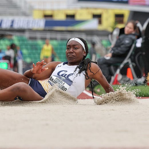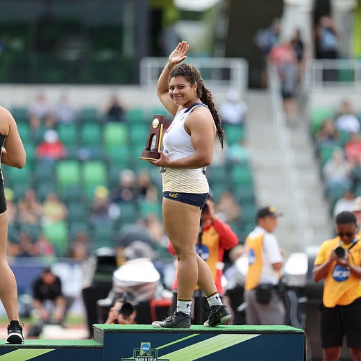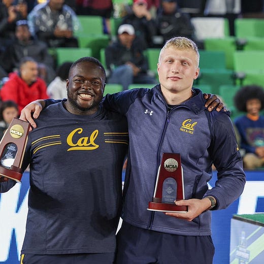 Also getting to compete at NCAA national championships for the first time were Ivar Moisander (menโs hammer throw), Busola Akinduro (womenโs triple jump), and the quartet of Jada Hicks, Jordyn Grady, Maisie Stevens, Aysha Shaheed (4x100m Relay), even if they finished toward the back of the 24 competitor deep fields or got DQโed, as in the case for Calโs relay team.
