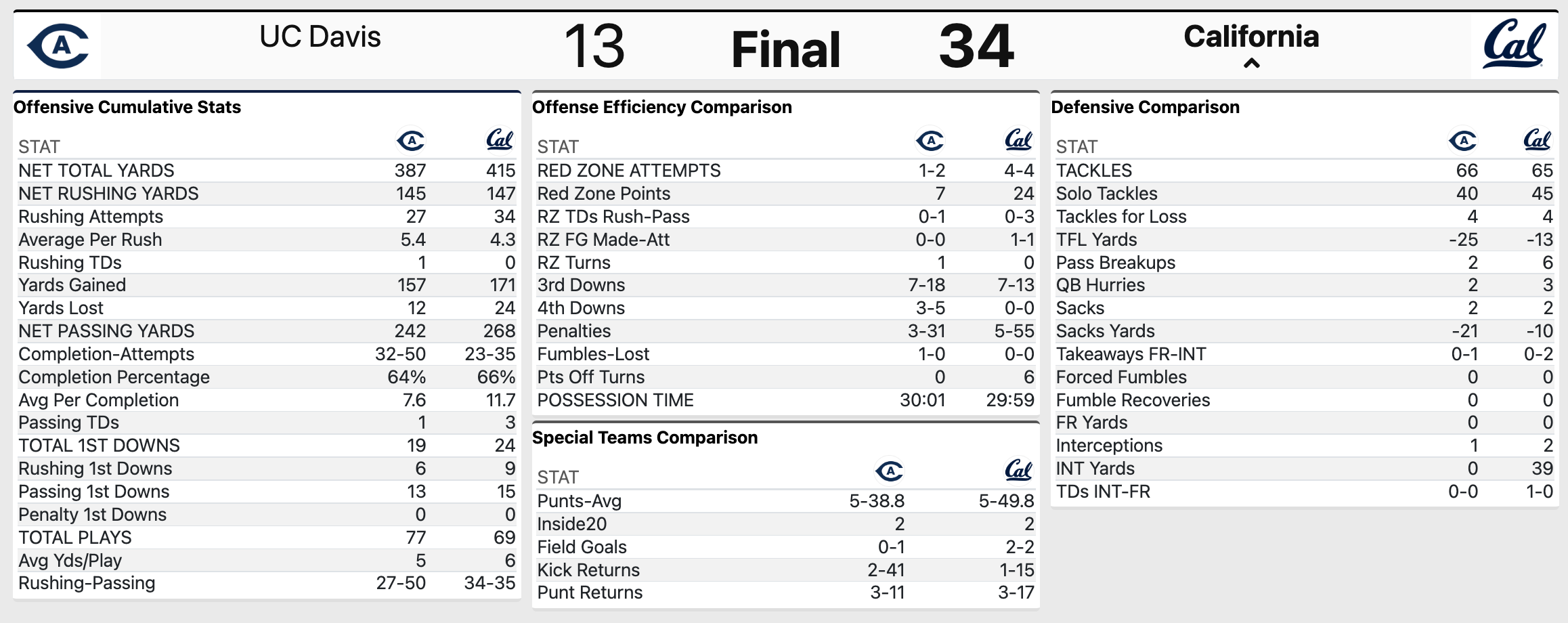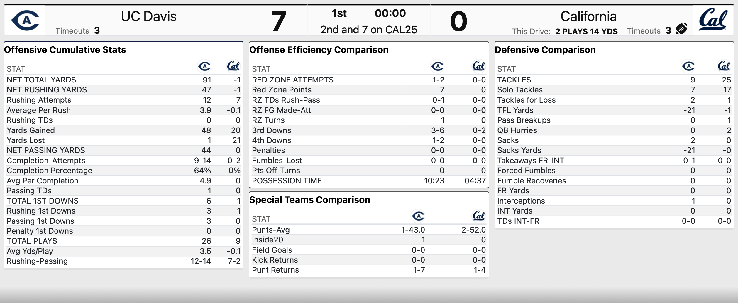 California, which had 10 players start their first game for the Golden Bears, got off to a slow start. The home team ended the first quarter with negative one net total yards to UC Davis' 91.