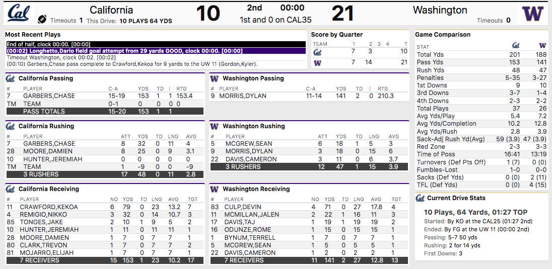 Justin Wilcox’s California Golden Bears (1-2) trail the Washington Huskies (1-2) at halftime, 10-21.
