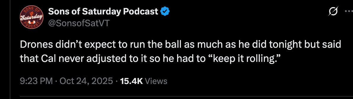 Drones, who carried the ball a startling 21 times, wasn’t expecting that workload heading into the night. However, Phillip Montogmery and company simply stuck with what worked and Cal didn’t adjust per the Hokies themselves.