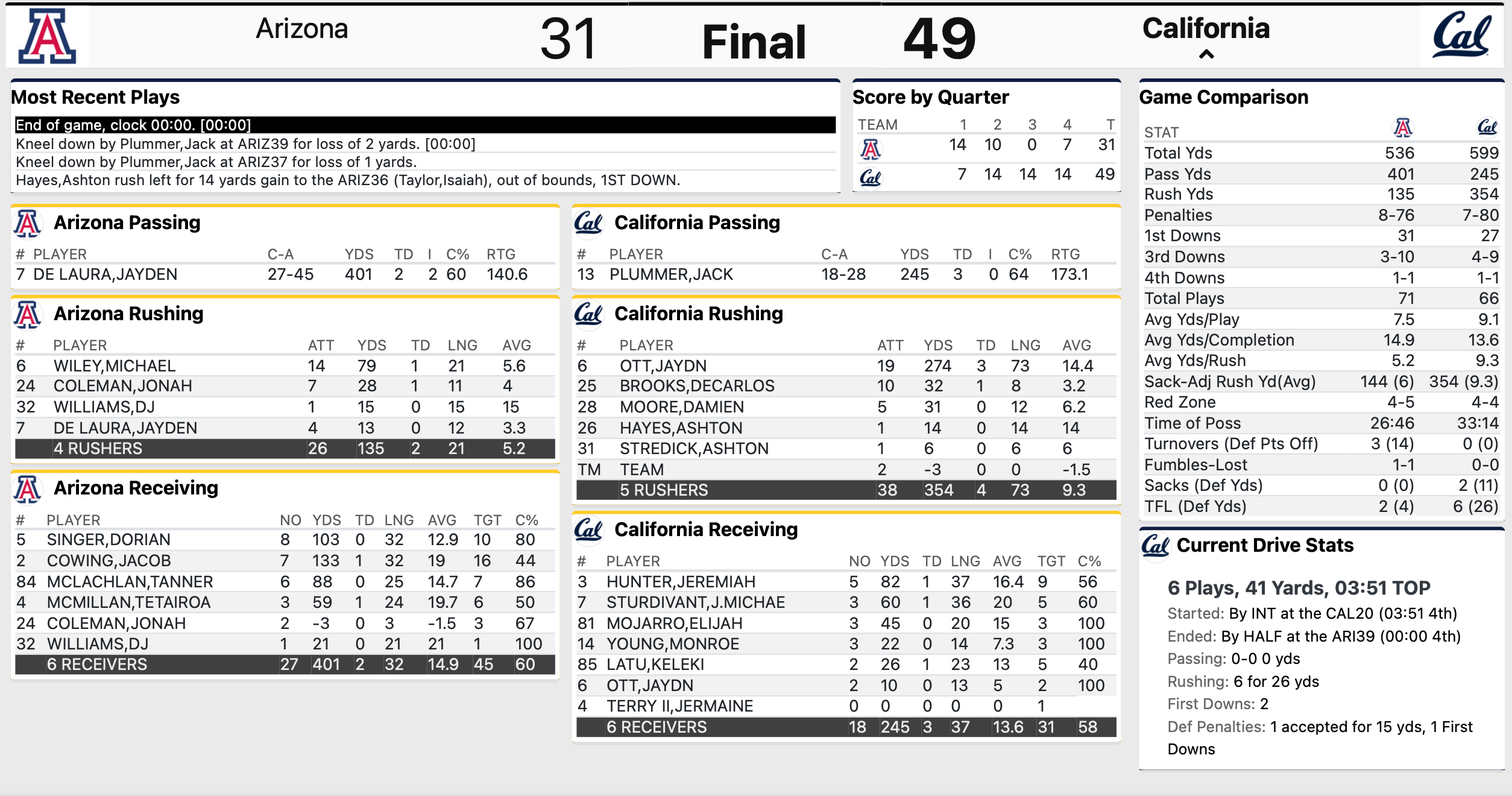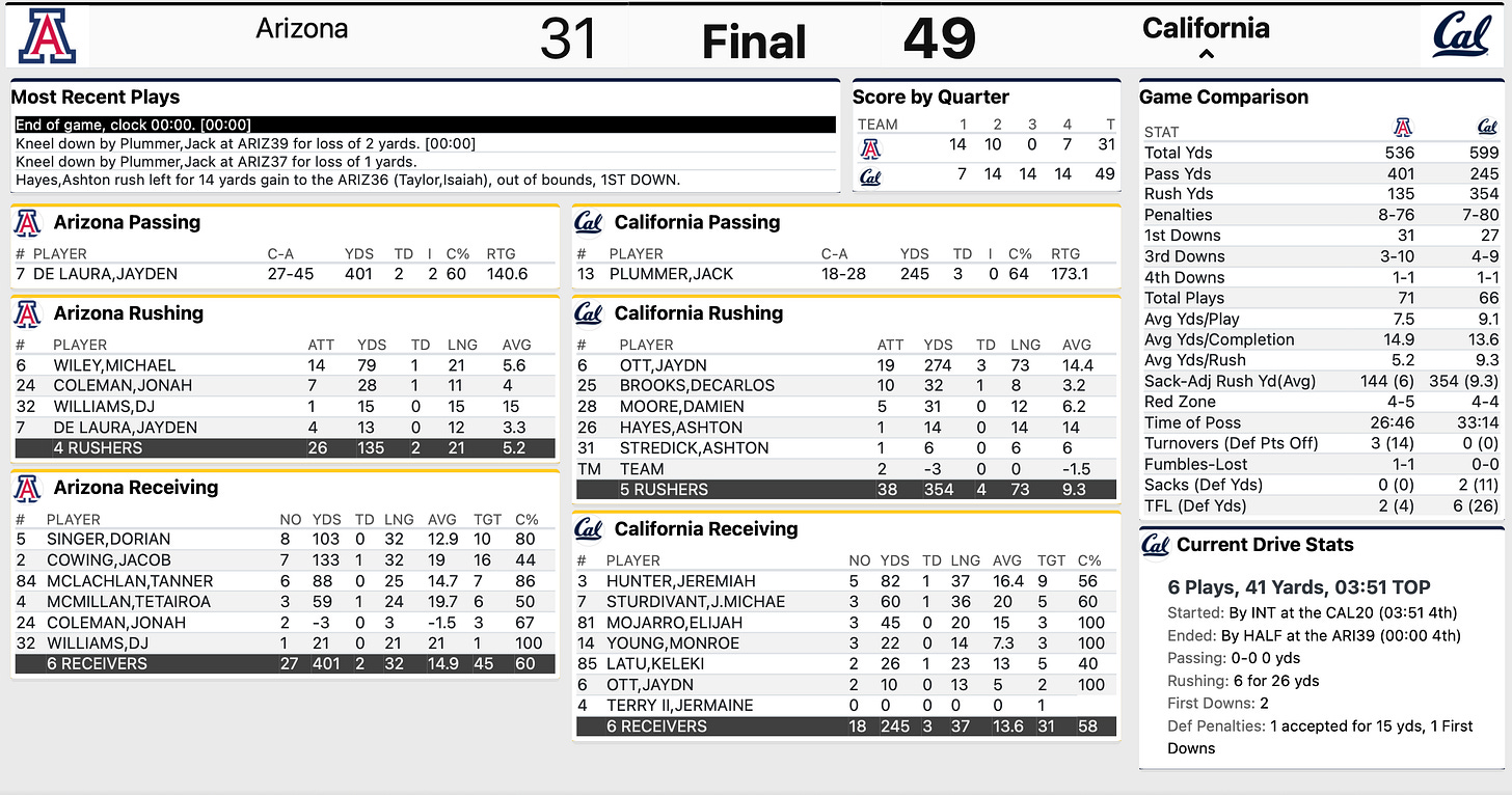 The story of this game was our re-invented o-line and how well they played. With them executing well, Jayden Ott was able to use his super human talents to rush for 274 yards (yes that's 274 yards!) and we had total offense of 599 yards. With the running game working, Tight Ends getting involved and our talented receiving corps doing their thing, fans who have been harsh critics of Musgrave finally were able to witness the multidimensional offense that he has given us and how well it keeps the opponent off balance...when we execute successfully. This was a hell of a fun game to watch. Our kids are going to gain a lot of confidence from this win. I think WASU will be a fun game as well. Go Bears!!!