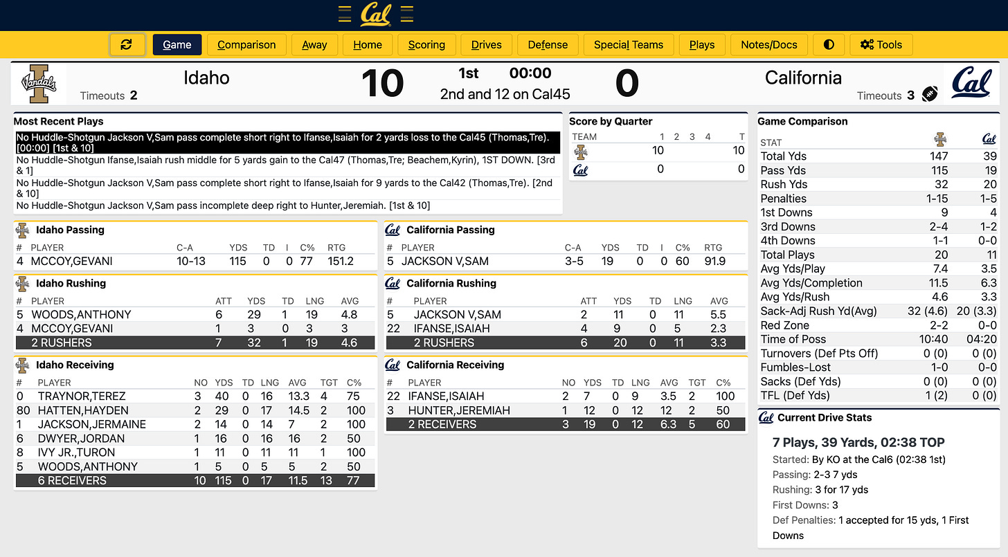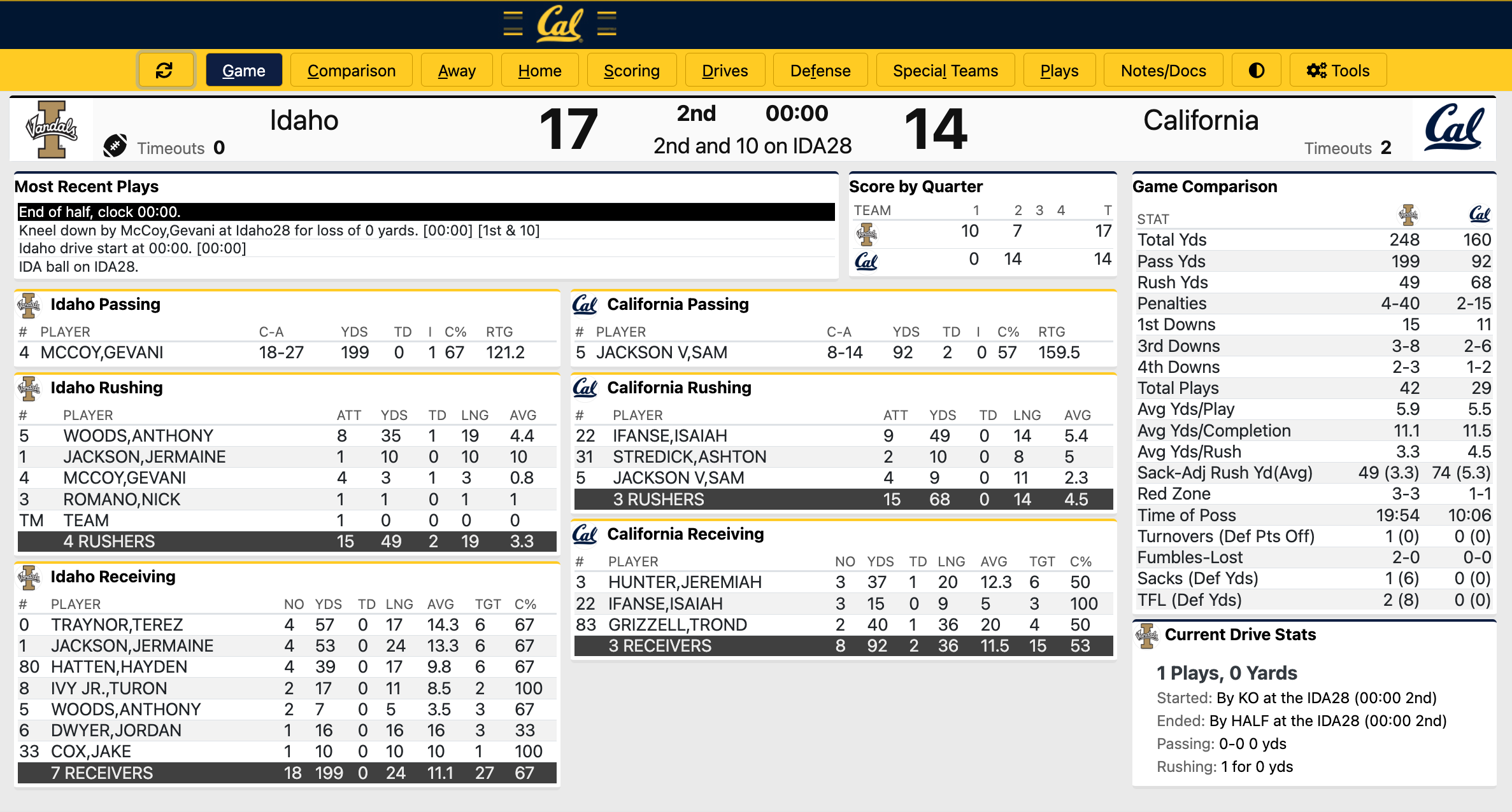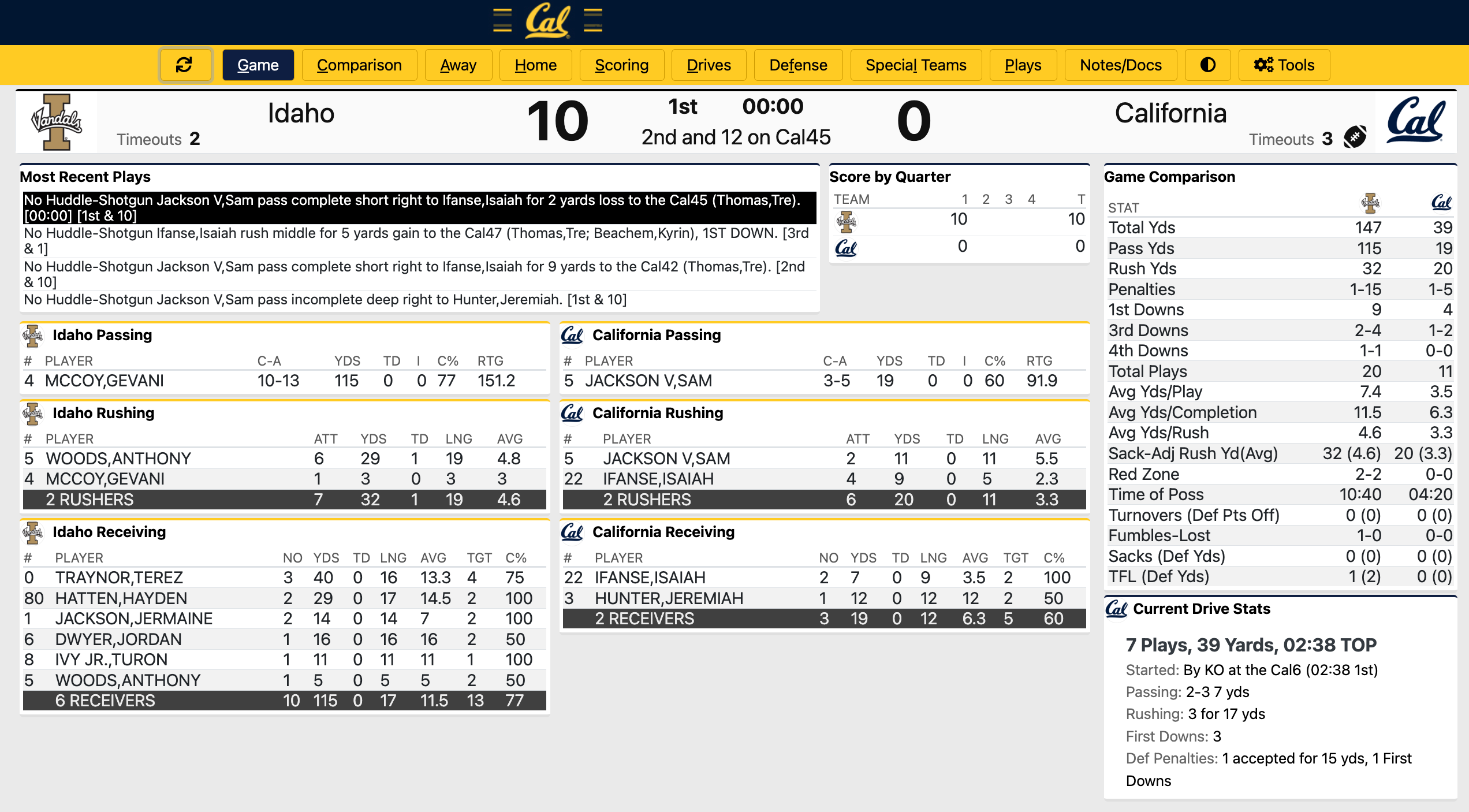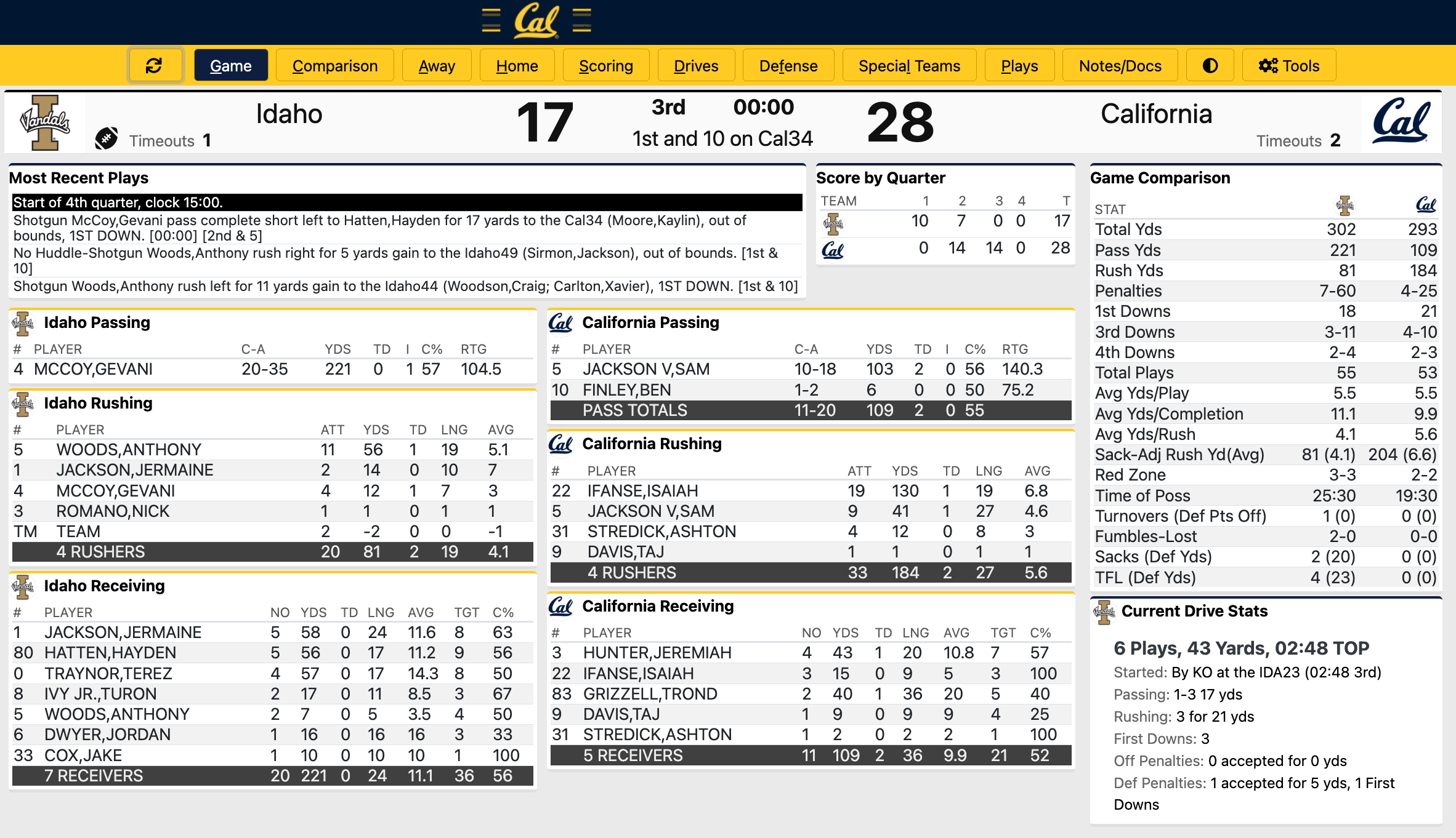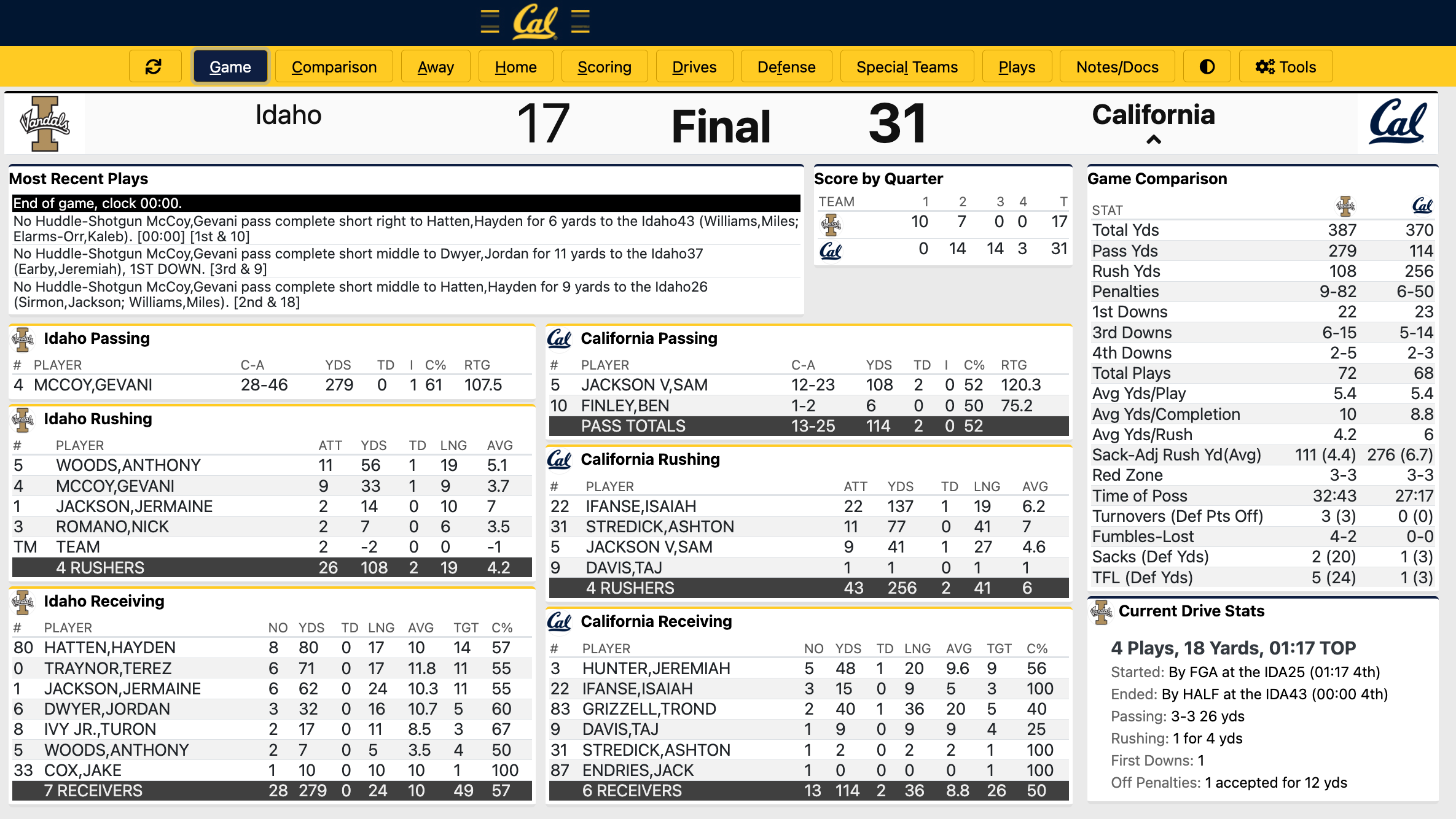 Cal v. Idaho College Football Fourth Quarter and Final Stats