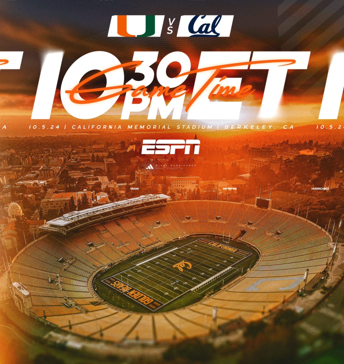 The California Golden Bears will play their ACC home season opener against the seventh-ranked Miami Hurricanes next Saturday, October 5. The game is set at 7:30 PM Pacific, 10:30 PM Eastern on ESPN.