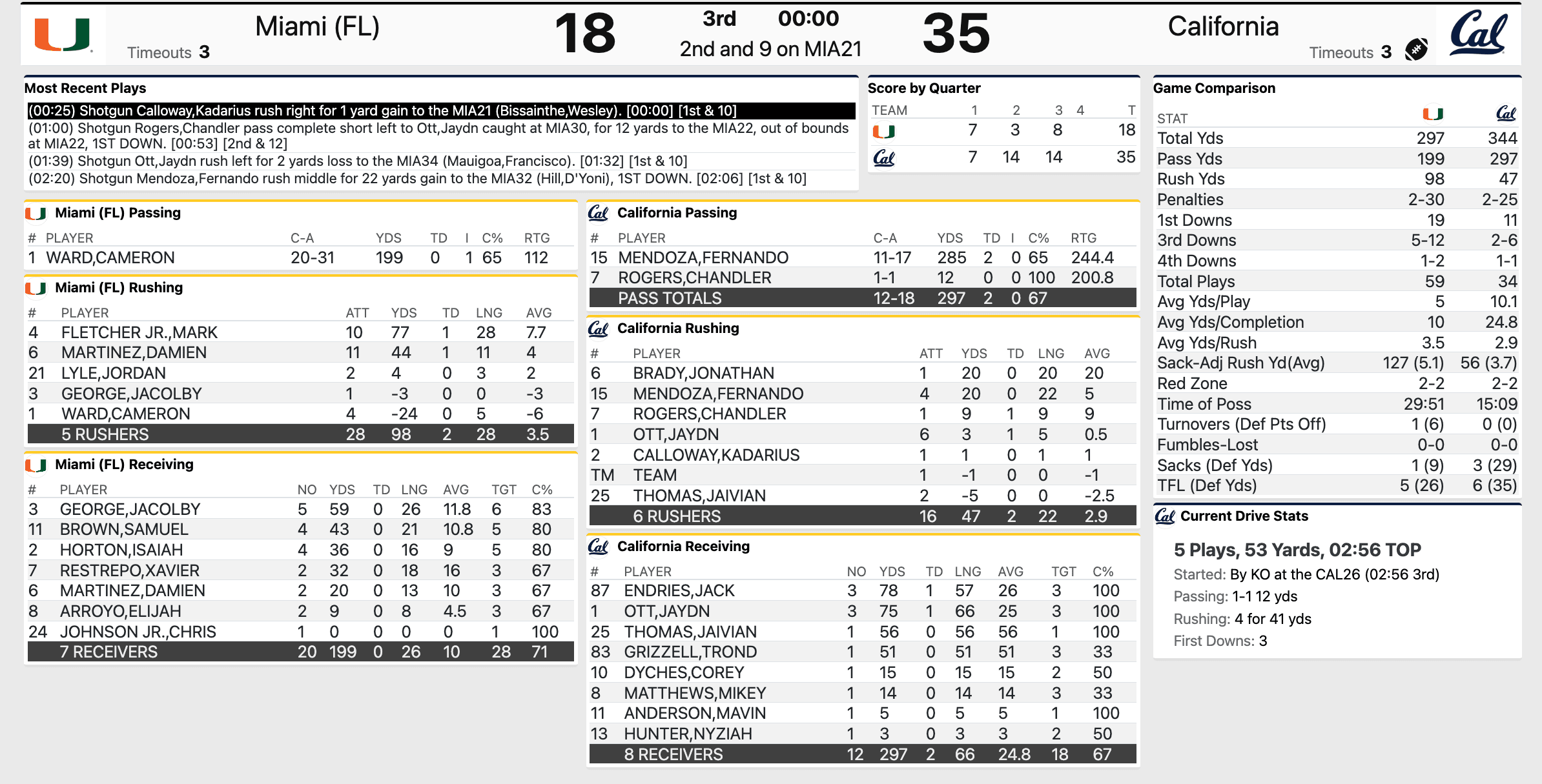 Cal v. Miami college football third quarter stats