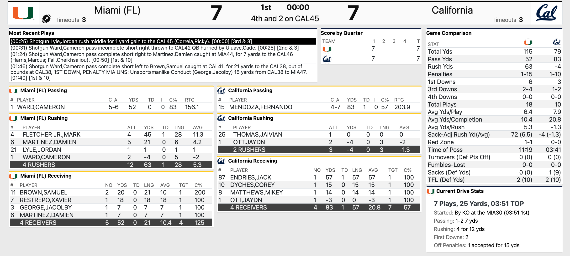 Cal v. Miami college football first quarter stats