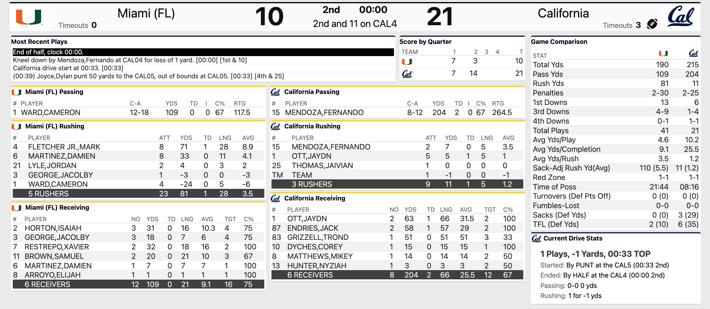 Cal v. Miami college football second quarter and first half stats