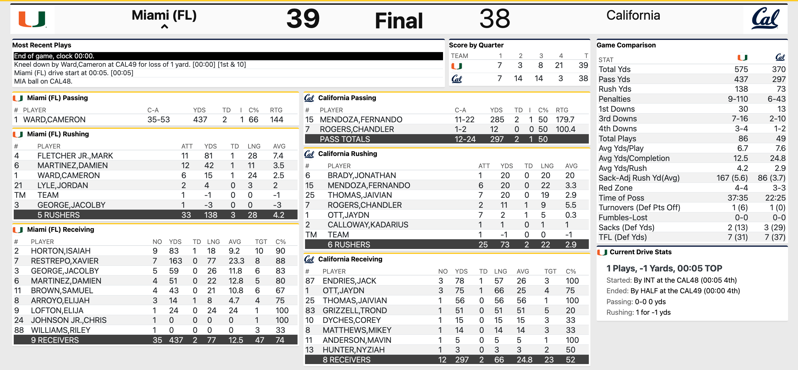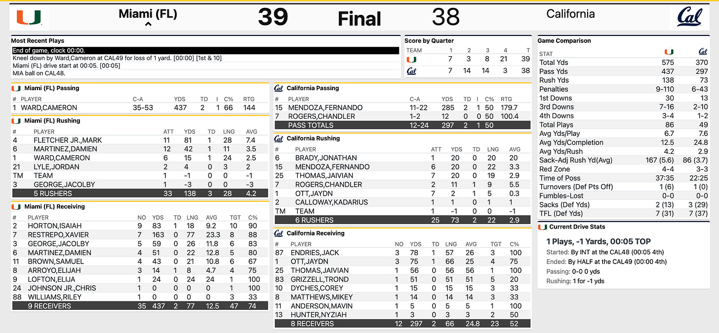 Cal v. Miami college football fourth quarter and full-game stats