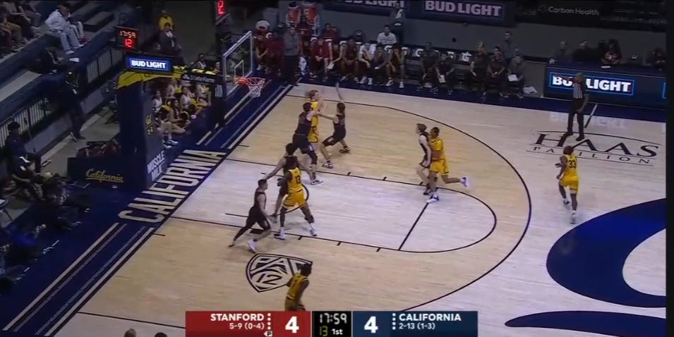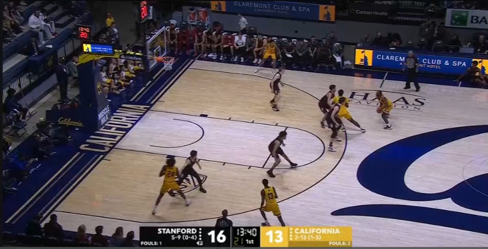 I had to watch this clip about 20 times to determine what type of defense Stanford is running. Watch it a few times and follow individual Stanford players. This is a man-to-man defense with so much space given up on the outside, in order to try to react quickly on the interior. When Cal drove towards the basket, Stanford was too slow to respond, leading to easy baskets inside or decent looking shots from the outside. Cal finished with 21 assists, the most for a Cal team since 2019.