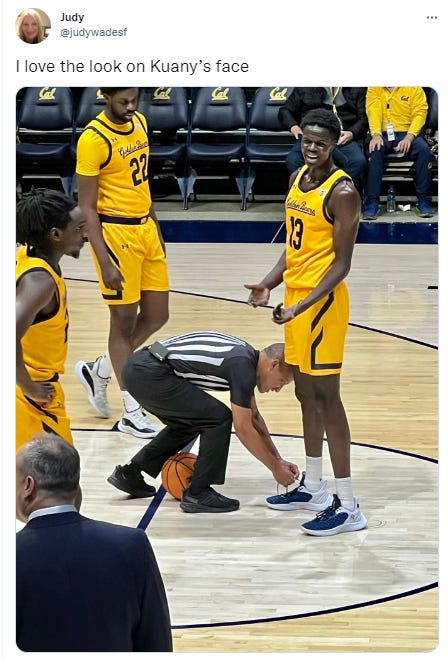 I think we were all with Nick early on. There was a sense that these shots were risky, or we were incredulous that Cal was taking as many outside shots as they were. The shots were early in the shot clock, some of them appeared to be bad decisions. It was so unlike anything we’d seen from Cal up to this point of the season. Certainly confidence goes up after a couple of them fall, and maybe they slow it down if they miss some of those shots. But Kuany, Alijiki, and Clayton were getting good looks. Below is maybe the worst shot selection from the first half.