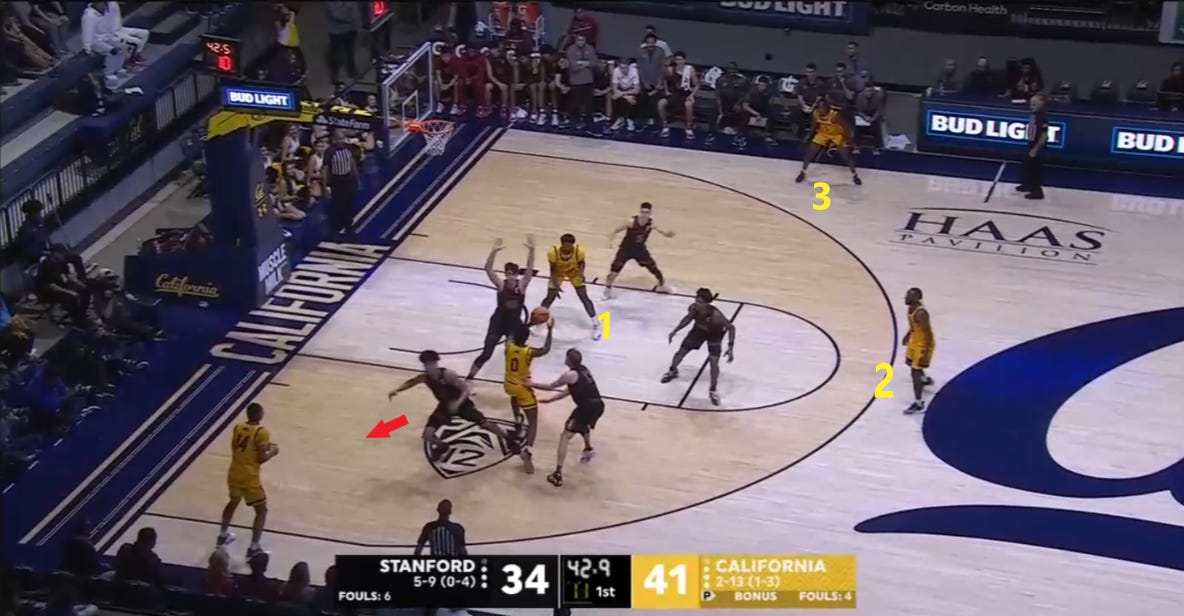 As the game progressed, Stanford was just too slow to react to Cal’s shooting. In his postgame comments, Stanford coach Jerod Haase said they tried multiple strategies to cool down Cal, but none of them were effective. Stanford was just slow and not tracking to where Cal’s players were positioned. This is my favorite sequence. Look at the positioning of Stanford on this drive from the wing by Marsalis Roberson.