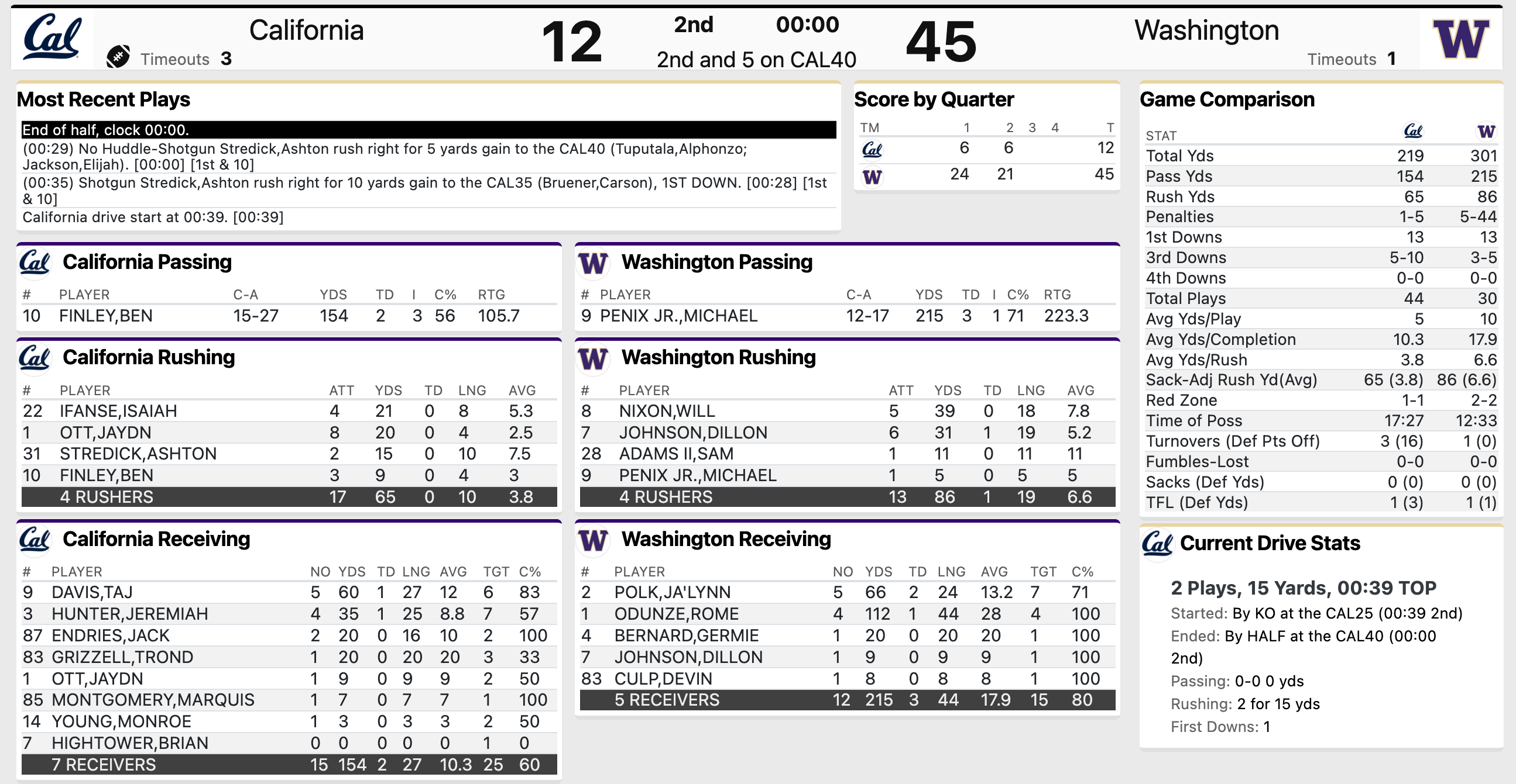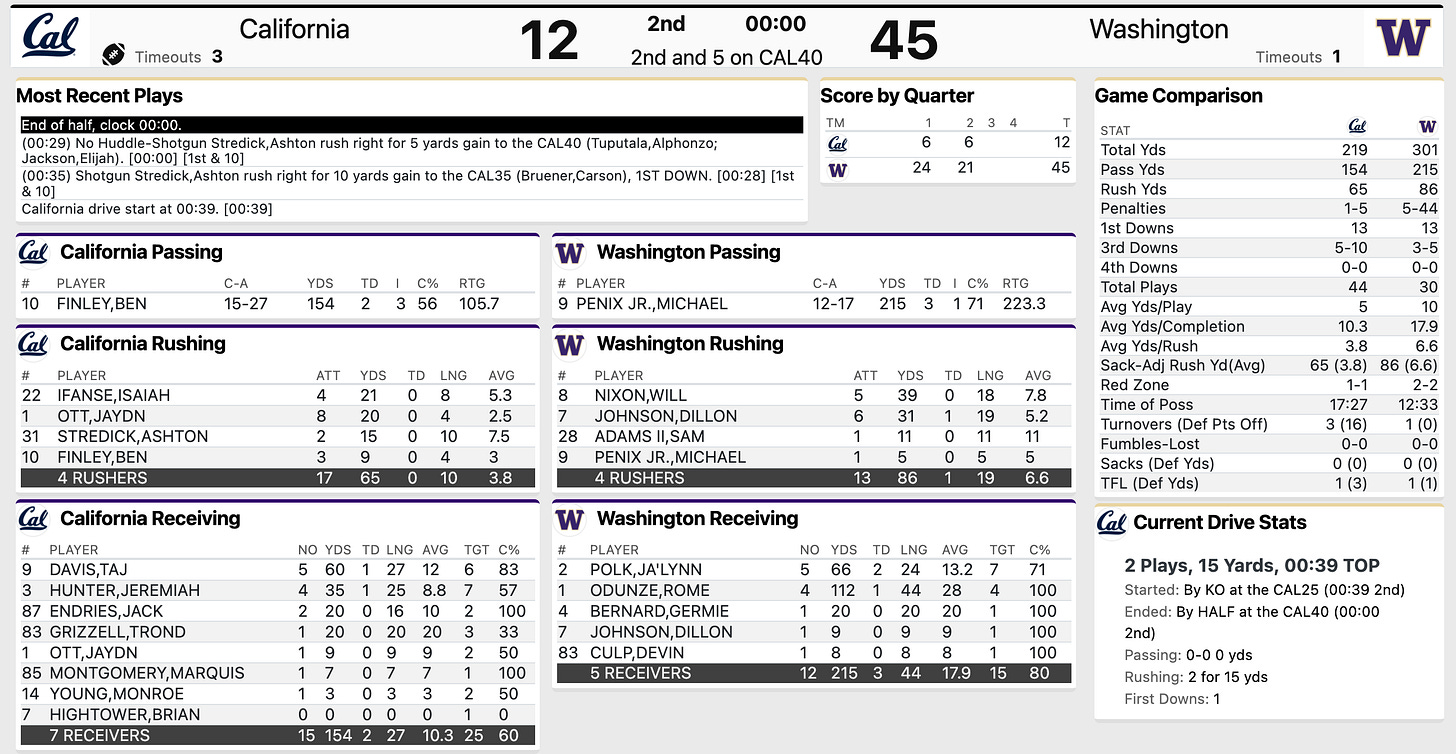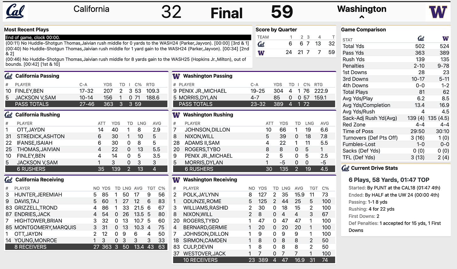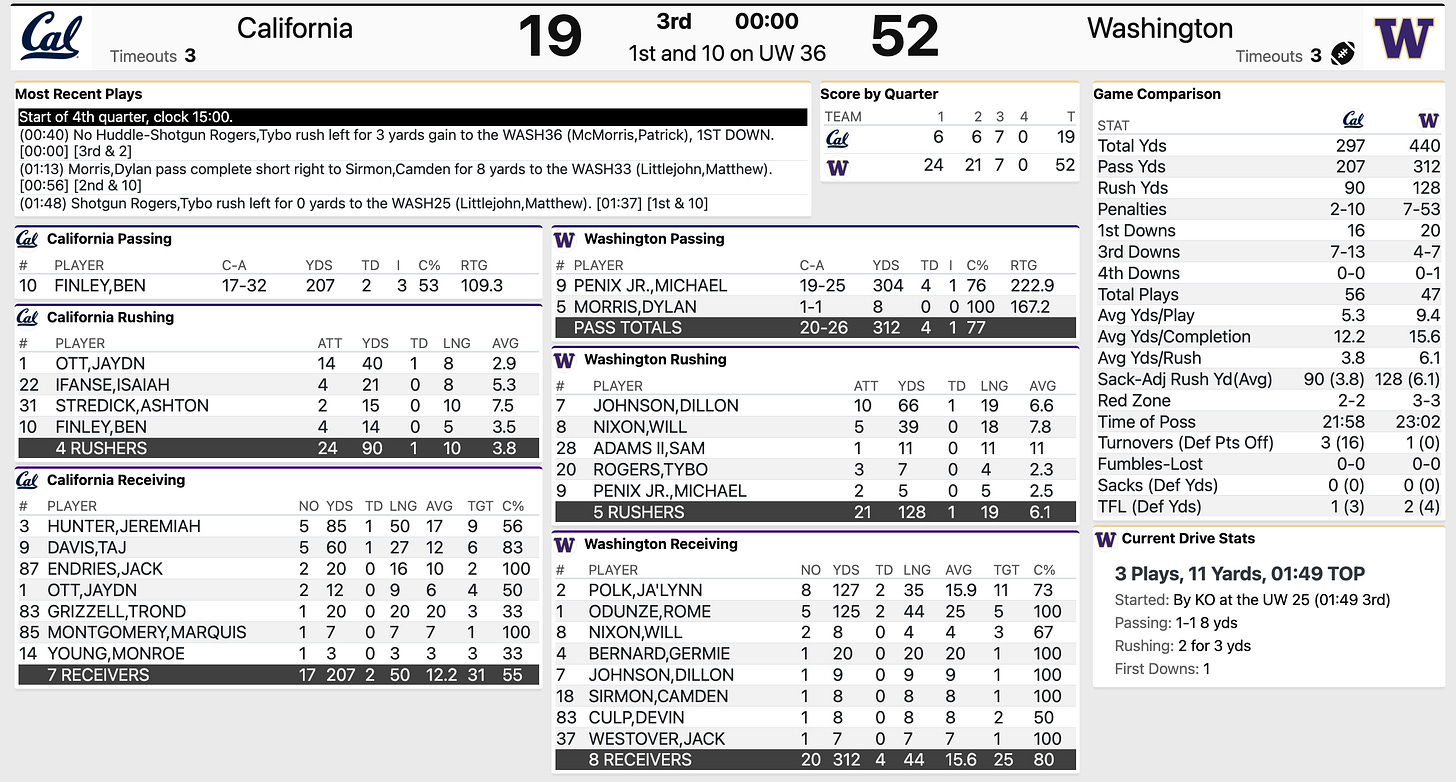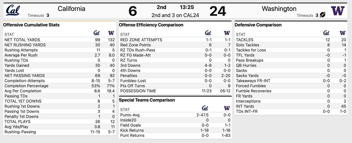 Left at half… sigh…didn’t have spotting UW a 2 touchdown lead before their offense even hit the field on my Bingo card. Much better Cal fans than I stuck around…kudos to hag, HSB, FireStarkey, YesWeCannon and the crew.