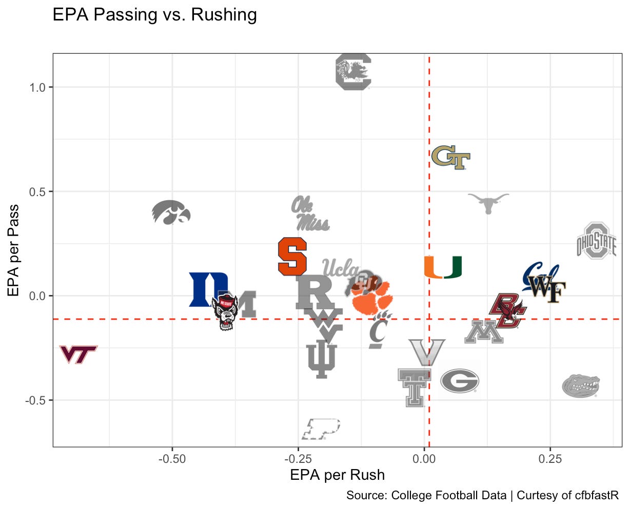 The plot below shows the EPA per rush plotted against the EPA per pass for P4 conference teams, with ACC teams highlighted. Cal’s EPA per rush was actually more impressive than its EPA per pass relative to other teams (notwithstanding the higher passing success rate).