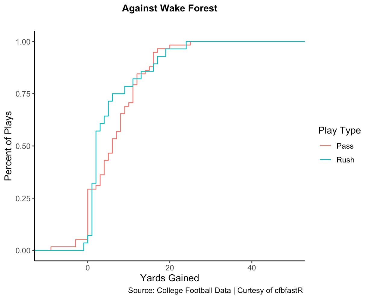 The answer is “somewhat.” Looking at the distribution over gains in the Wake Forest game, passing plays seem to somewhat reliably yield at least as many yards as rushing plays.