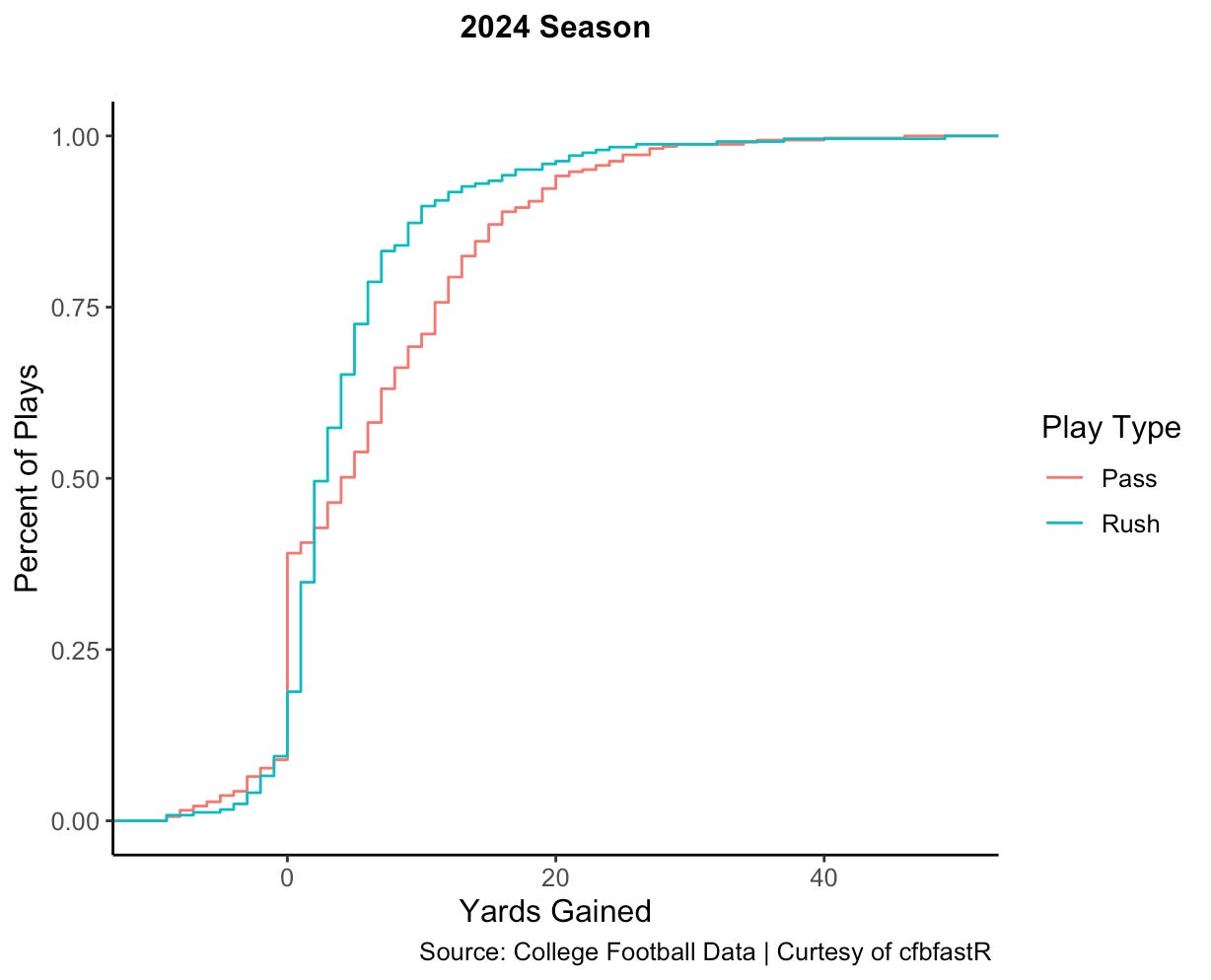 But it is also worth considering the cumulative distribution of yards gained by play type. In other words, what percent of passing plays generate a certain yardage gain—and comparing that to the percent of rushing plays the generate the same yardage gain. Do this for each possible yardage gain and you have the cumulative distribution over yards gained.