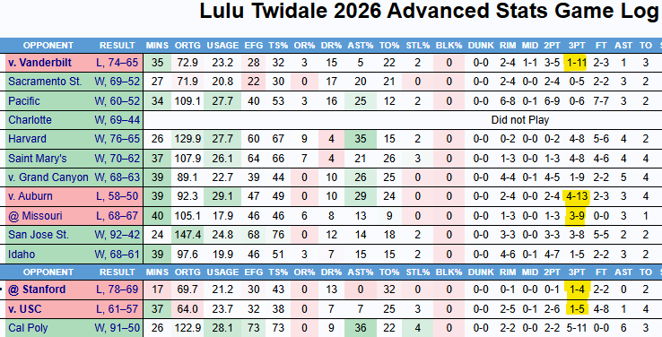 I’m actually encouraged that Twidale took fewer 3s against Stanford and USC, and that Cal played comparatively better against those tougher teams. I think that’s a sign that Twidale is being a little more selective with her shot in part because Cal has found other sources of offense as compared to earlier in the year, when Twidale was putting up more shots out of necessity.