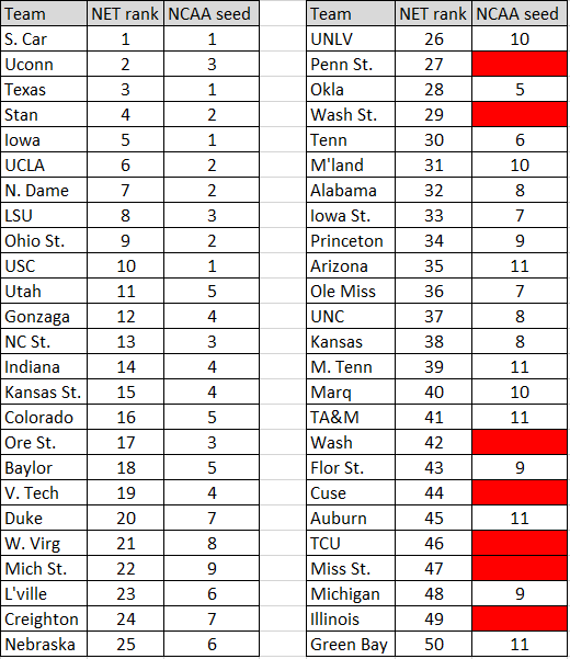 Now consider: here is last year’s top 50 in the NET, and the NCAA seed that the team subsequently received: