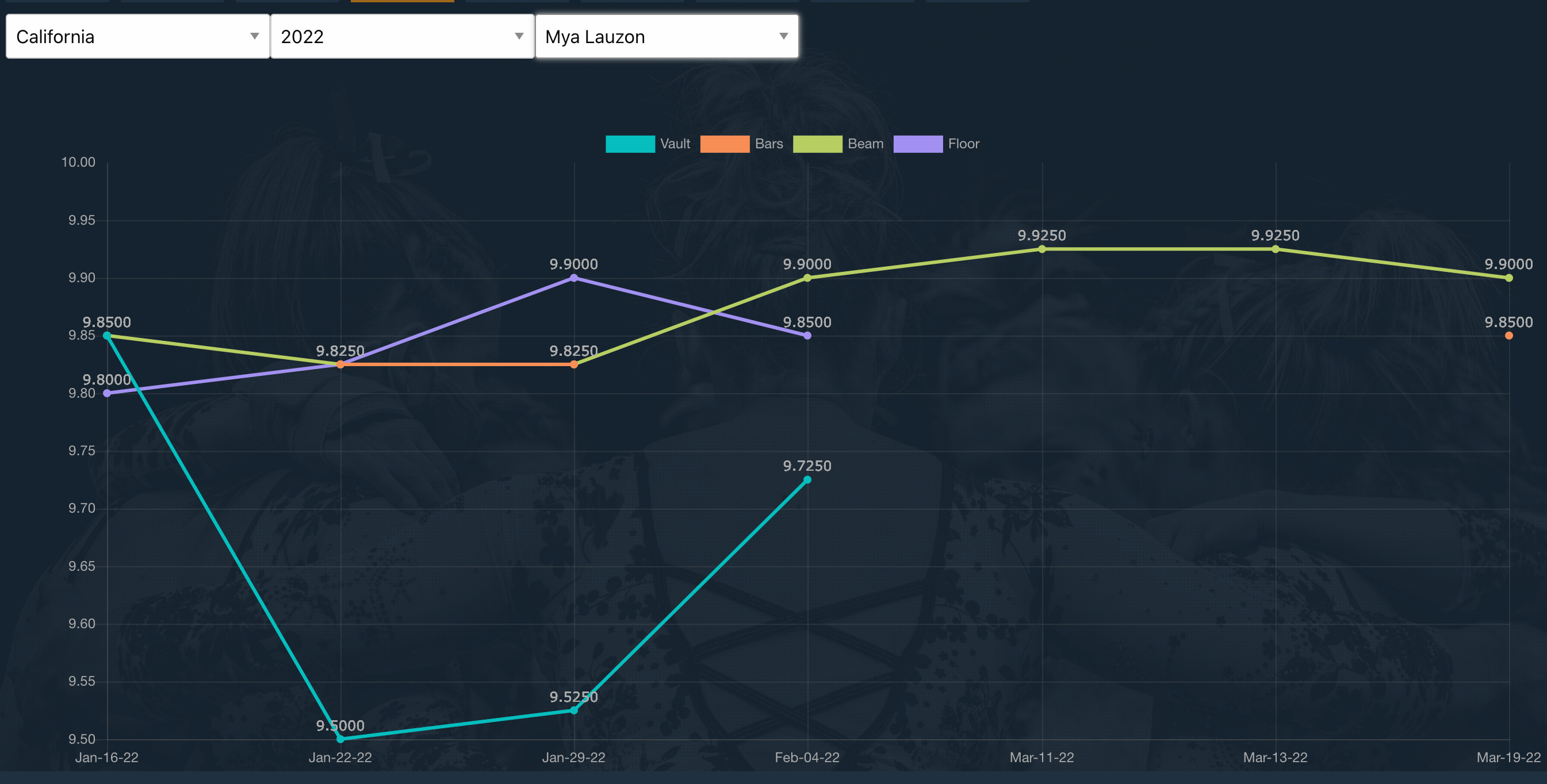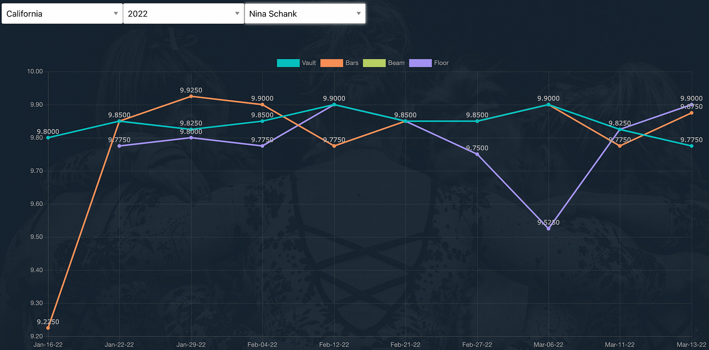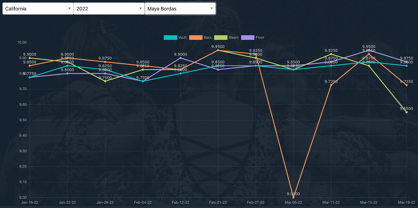 Bordas is coming off a Pac-12 Championship where she struggled on her first two routines before recovering. She is certainly capable of a 10 on bars, but also on beam and floor since she has got 9.95 on both this year.