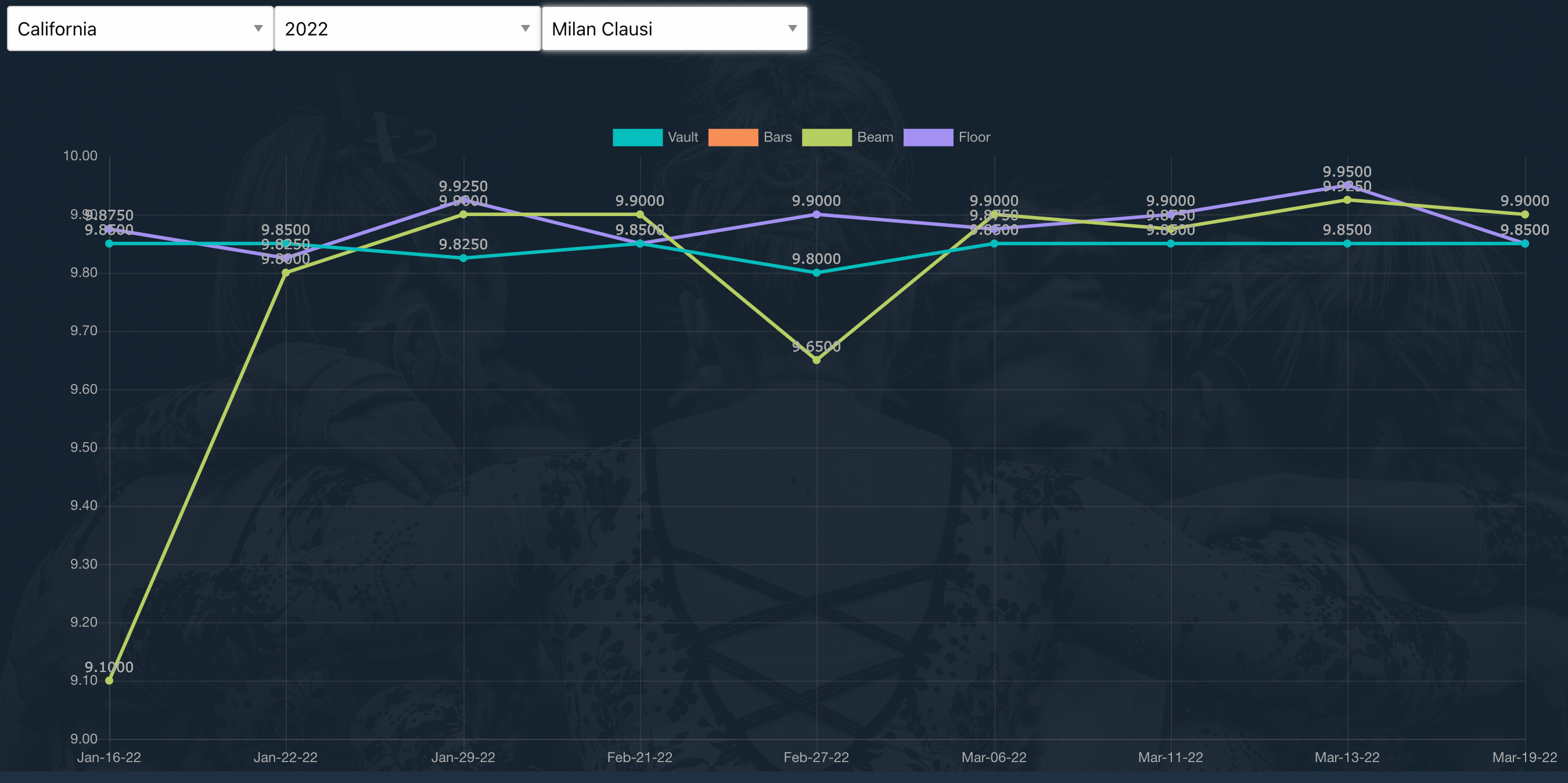 A rotation mainstay since her freshman year on beam, vault, and floor, Milan Clausi’s routines stand out for having unique flairs. Clausi is one of only two Cal Bears with a starting value of 10 on vault (the rest only got a 9.95 vault).