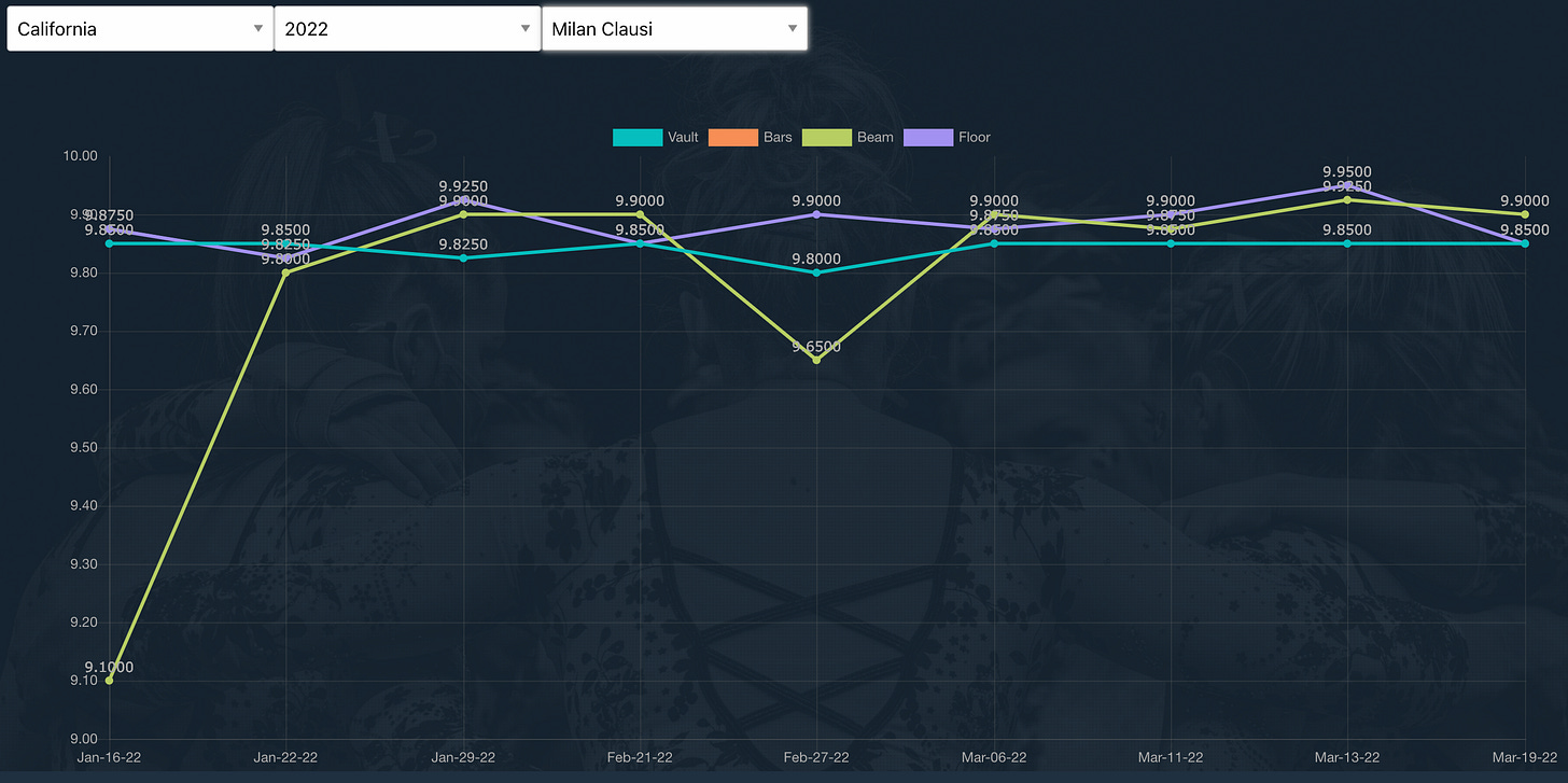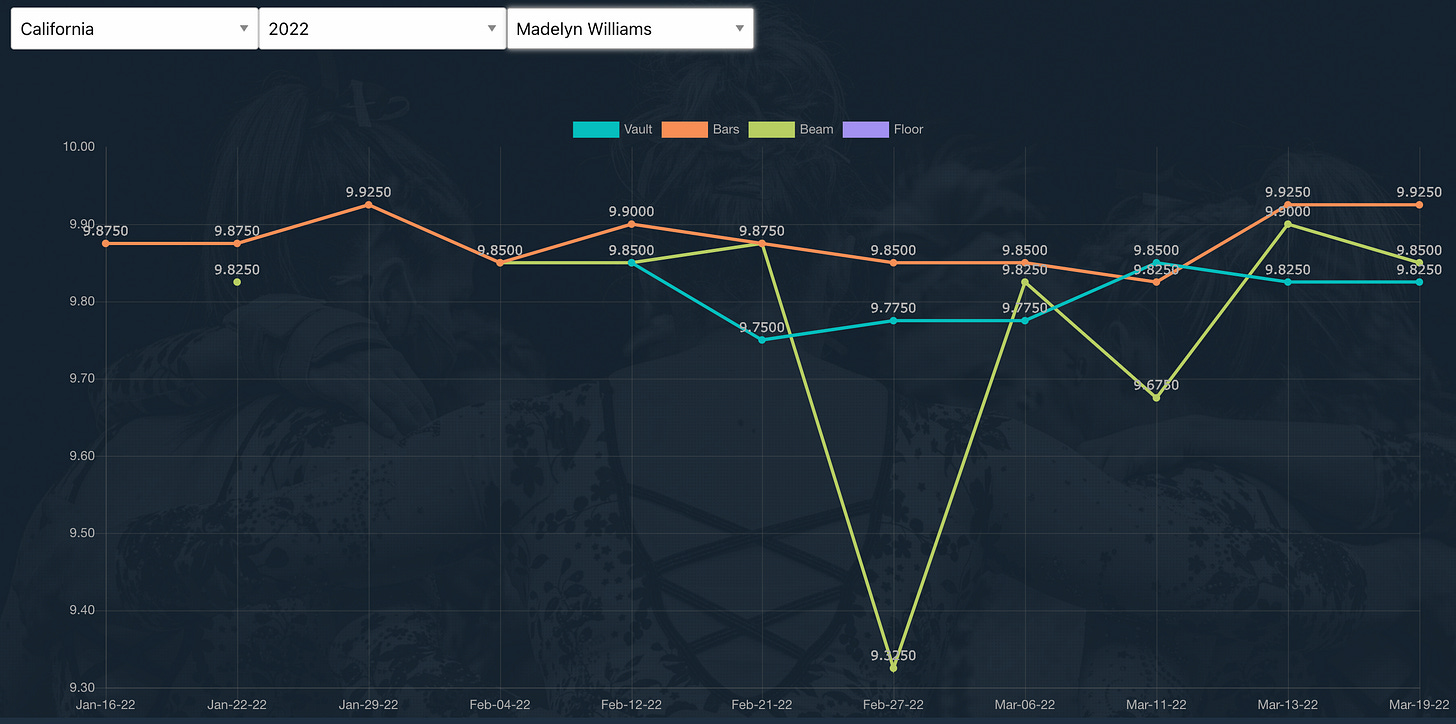 Bears had a surprisingly tough start to the floor rotation, but everyone else delivered to send the Bears to Saturday's Regional Final! I wrote in the article how I would feel comfortable with Grace Quinn as the floor anchor and the season on the line, and she came through in clutch with a big 9.925 score (I was still nervous watching it though).