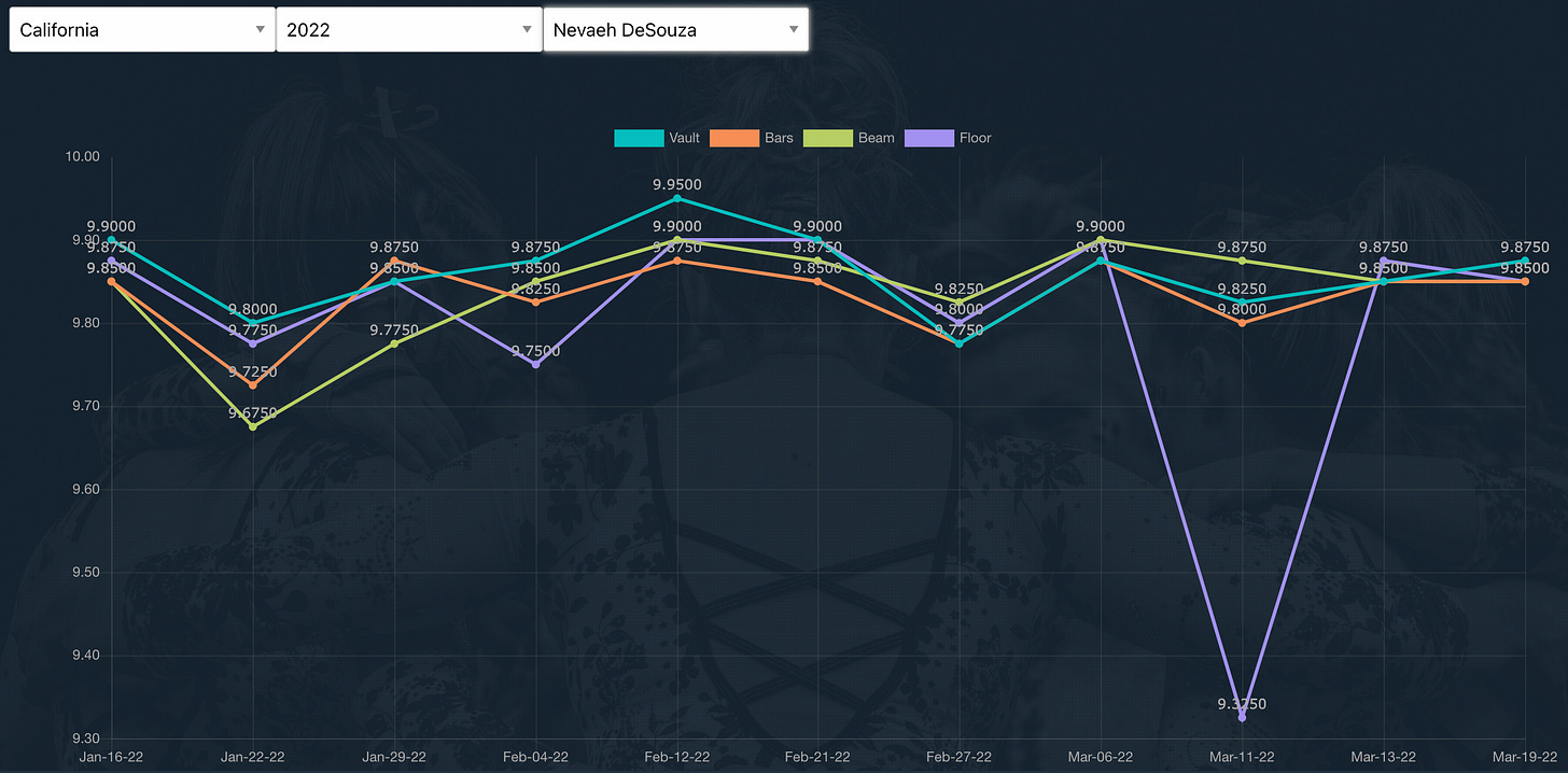 Other than the Ohio State meet where she landed out-of-bounds on her floor exercise, DeSouza is virtually a lock to score 9.85+ on all four routines.